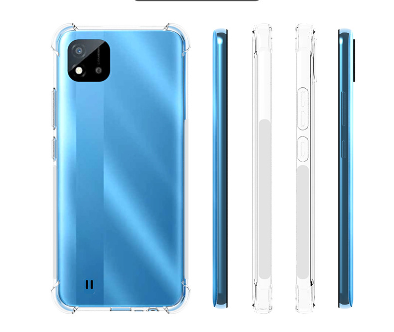 Ốp lưng dẻo trong chống sốc Realme C11 2021, Realme C20 chất liệu TPU dày 0.9 mm, mềm dẻo, trong suốt, có độ đàn hồi cao, có thể bóp lại, cuộn lại mà không biến dạng. Ốp lưng được thiết kế với 4 góc dày dặn hơn (hầu hết khi rơi máy các góc sẽ va chạm đầu tiến), kết hợp với phần khung viền từ nhựa dẻo TPU cao cấp khá dầy dặn (~1mm), phần tiếp xúc với cạnh máy có làm thêm các đường gân không những giúp cho ốp cầm chắc tay hơn mà còn tăng khả năng đàn hồi, bảo vệ toàn bộ máy luôn an toàn trước mọi va chạm, mặt lưng còn 4 chấu nhỏ nhô cao để nâng phần lưng của máy lên khi để lên bàn hạn chế xước Camera sau của máy. Mọi chi tiết hoàn thiện của ốp lưng đều làm rất đẹp, các vết cắt mịn, đều. Các phím bấm được làm nổi giúp thao tác dễ dàng.