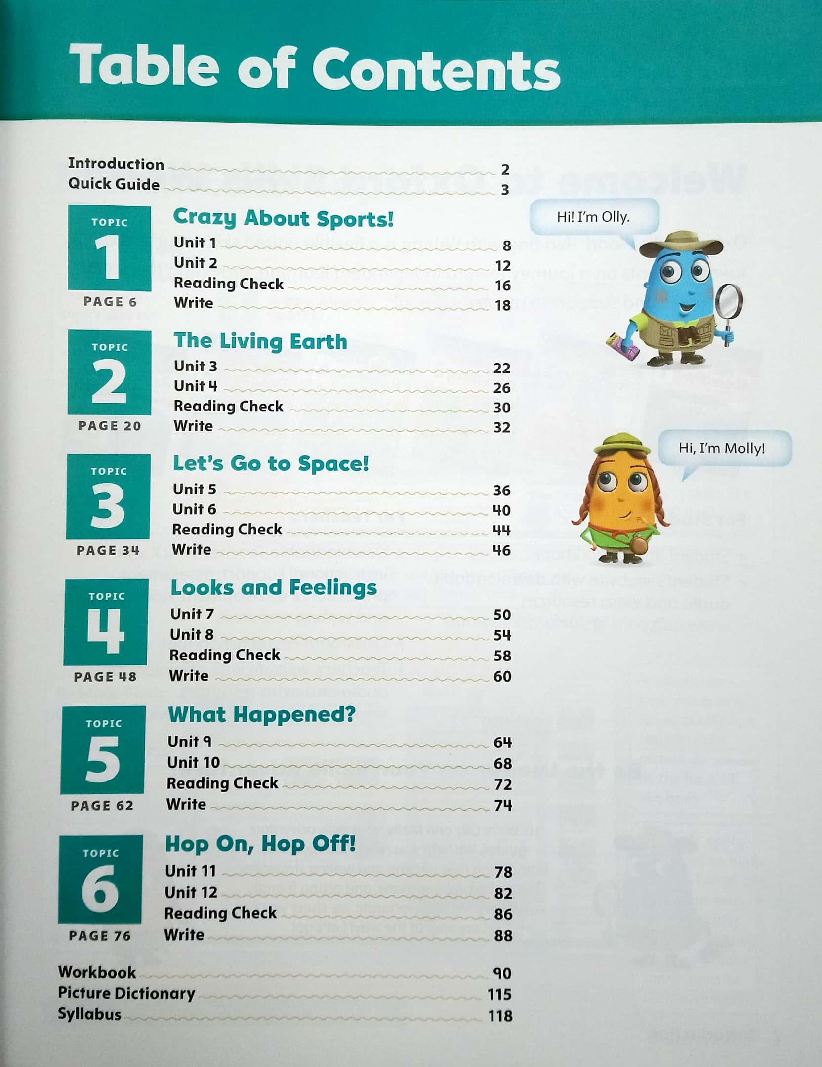 The Oxford Skills World: Reading with Writing Student Book / Workbook has six topics, and each topic has two units. There are clear learning goals on every page, each topic follows the same structure, and on-the-page characters Olly and Molly keep young learners active and engaged with the material.