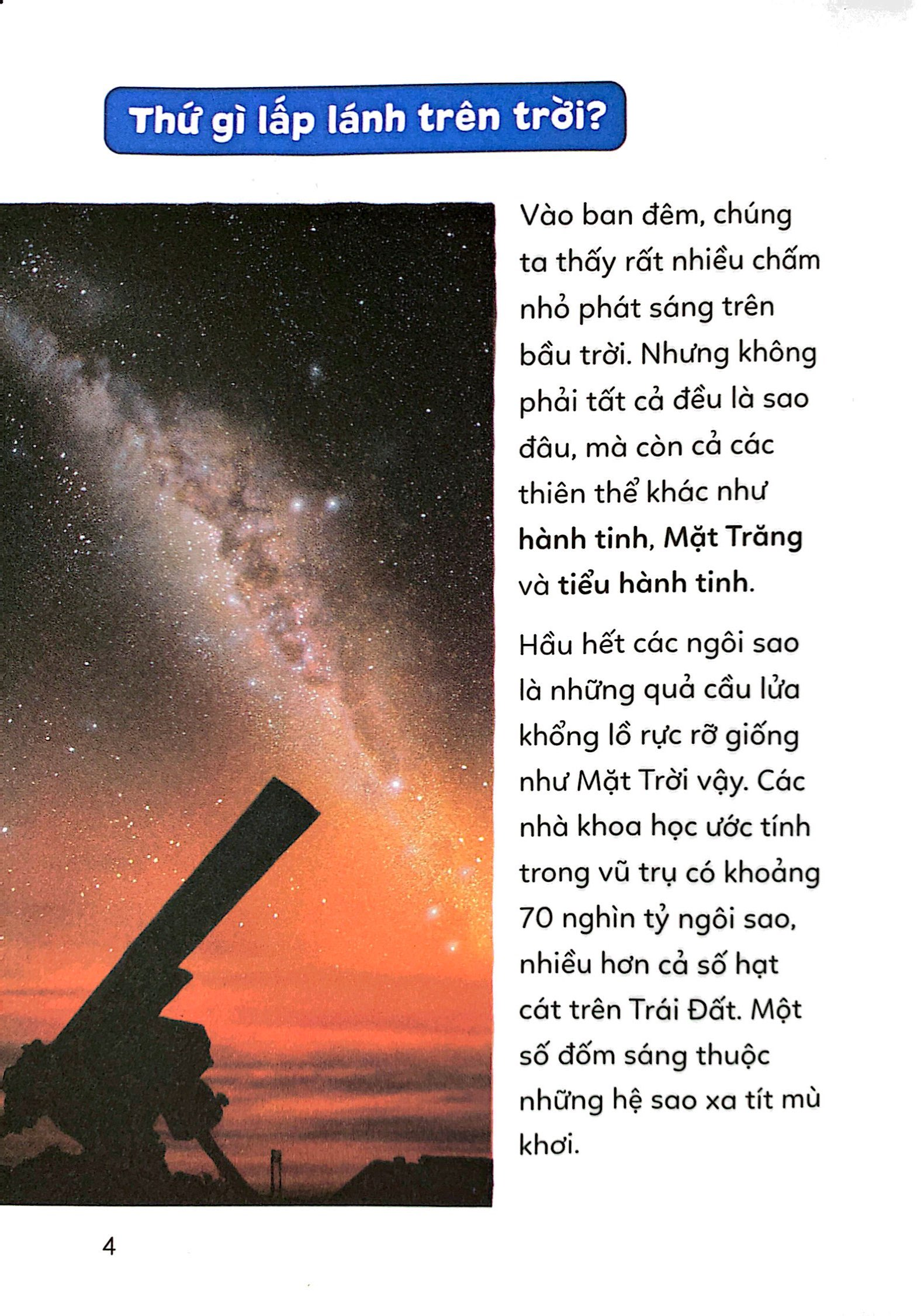 Nội dung: Cuốn sách đưa các bé vào một hành trình khám phá vũ trụ đầy hấp dẫn. Từ những hành tinh trong hệ mặt trời, các vì sao, đến những hiện tượng thiên văn kỳ thú như hố đen, siêu tân tinh,... tất cả đều được trình bày một cách đơn giản, dễ hiểu và sinh động.