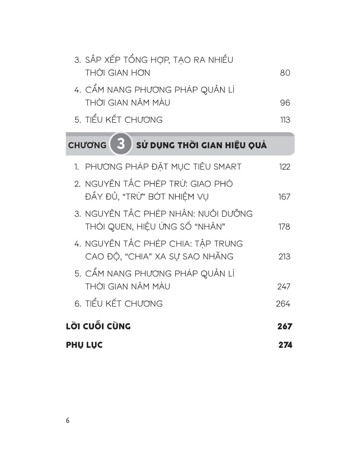 - Cấp độ thứ năm: Hình thành những thói quen nhỏ, khiến việc duy trì trở nên dễ dàng hơn. Cuốn sách này đưa ra 3 mẩu chuyện ngắn về phương pháp quản lí thời gian năm màu, 13 thực chiến quản lí thời gian năm màu, 14 cẩm nang phương pháp quản lí thời gian năm màu và 26 sơ đồ tư duy phương pháp quản lí thời gian năm màu. Trong phần Phụ lục có 11 lý thuyết quản lí thời gian thường thấy, 5 ứng dụng thường dùng để quản lí thời gian, danh mục sách tham khảo về quản lí thời gian và năm màu trong cuộc sống. Áp dụng phương pháp này vào thực tế, bạn sẽ sống một cuộc đời đầy màu sắc, cân bằng và tự do hơn!