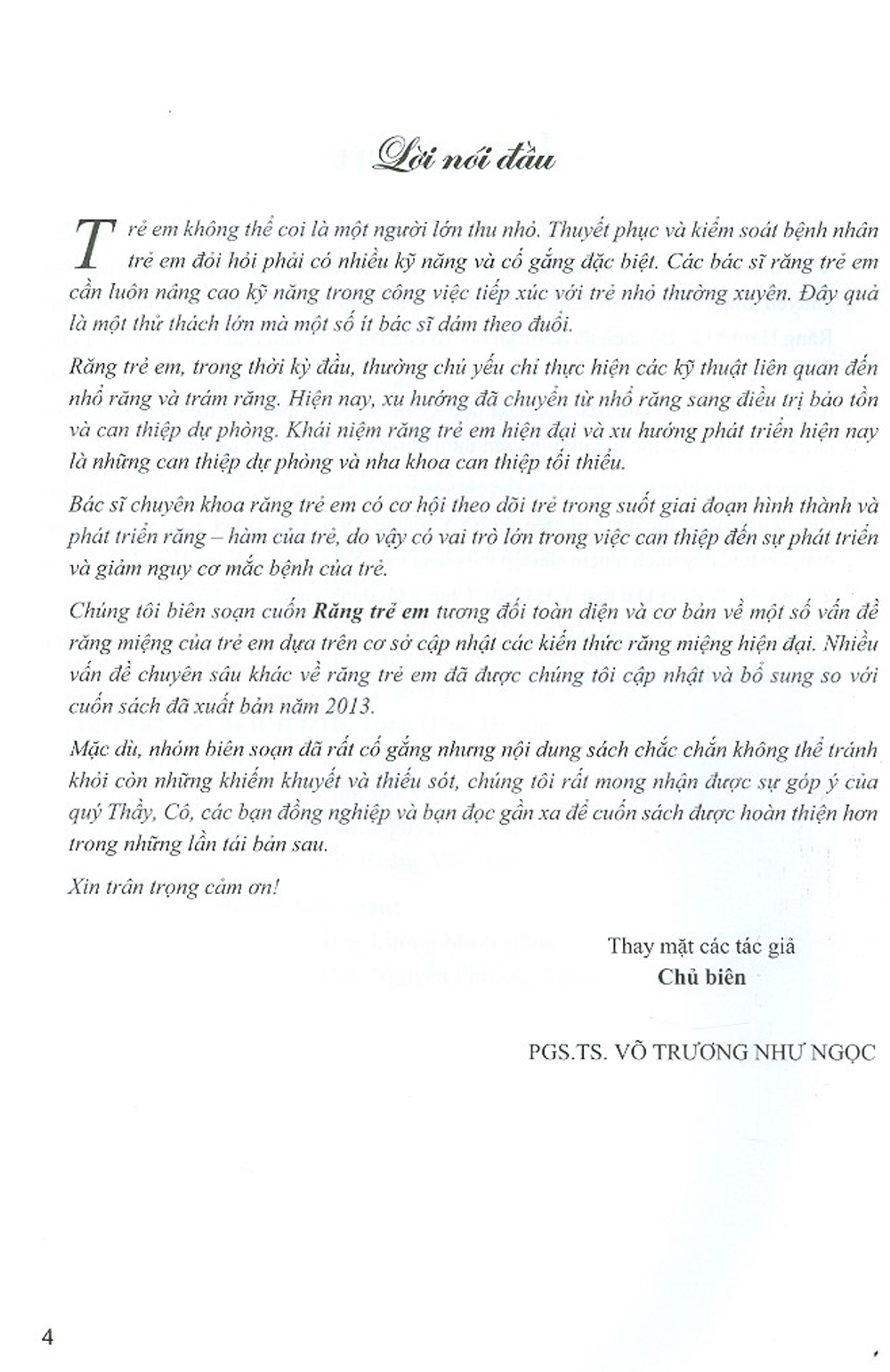 Chúng tôi biên saon cuốn Răng trẻ em tương đối toàn diện và cơ bản về một số vấn đề răng miệng của trẻ em dựa trên cơ sở cập nhật các kiến thức răng miệng hiện đại. Nhiều vấn đề chuyên sâu khác về răng trẻ em đã được chúng tôi cập nhật và bổ sung so với cuốn sách đã xuất bản năm 2013.