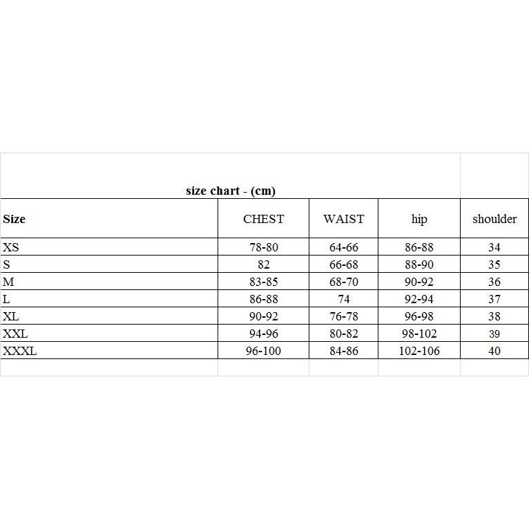 XL : ngực 92cm; vai 38cm; eo 78cm; mông 98cm ; cao 155-160cm