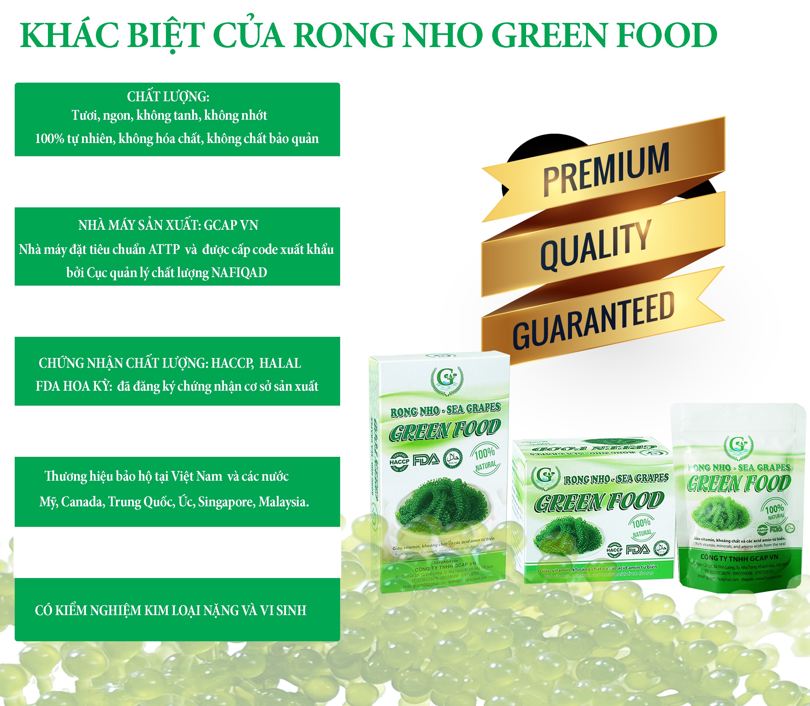 - Sản phẩm được tin dùng tại nhiều quốc gia trên thế giới: Mỹ, Canada, Úc, Singapore Rong nho Green Food luôn nỗ lực mang đến cho khách hàng những sản phẩm xanh, sạch và bổ dưỡng nhất CHỨNG NHẬN CHẤT LƯỢNG HƯỚNG DẪN SỬ DỤNG