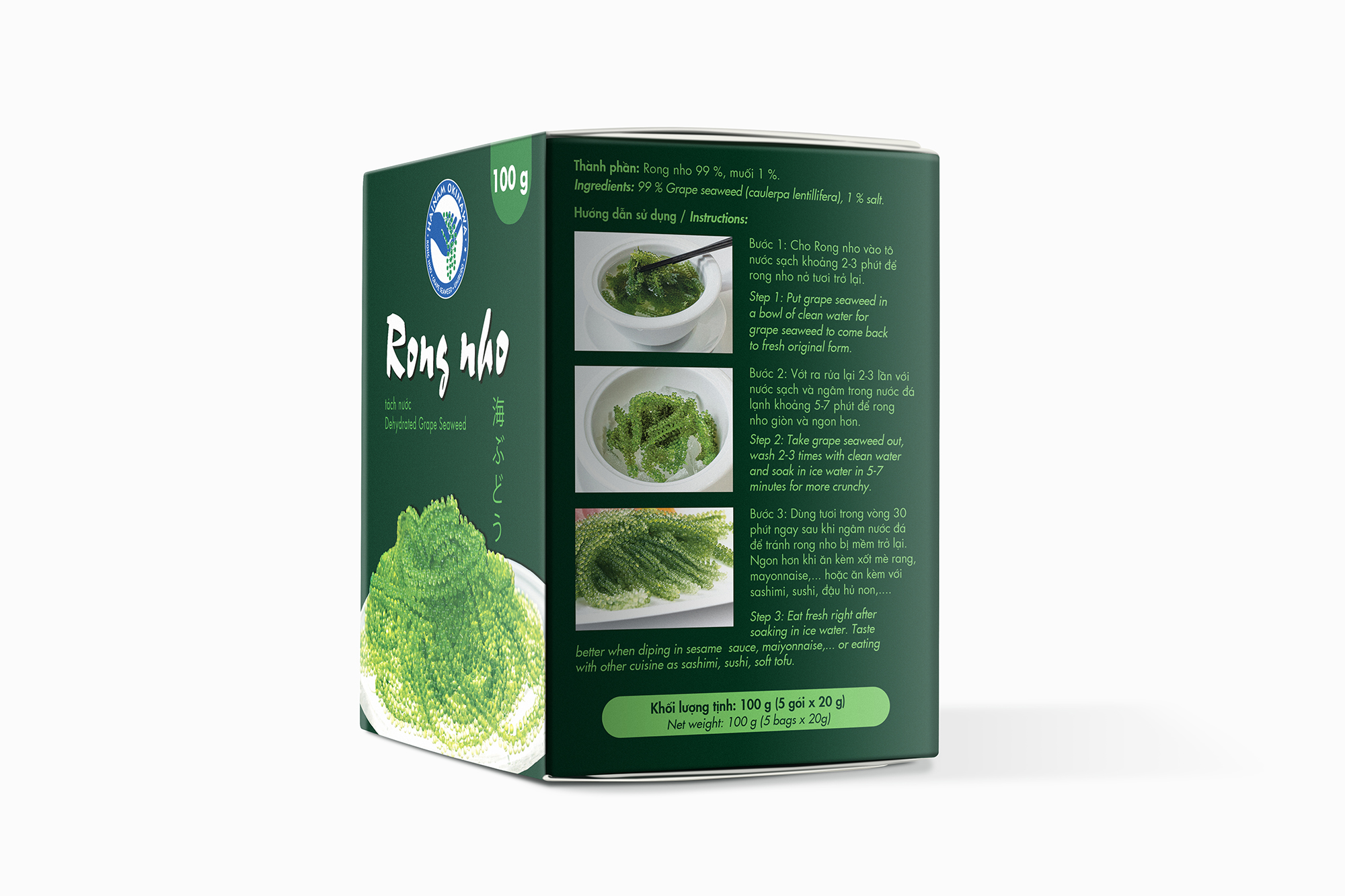 - Tên sản phẩm: Rong nho Trường Thọ - Tiêu chuẩn: Đạt chuẩn Hoa Kỳ - Thành phần: 100% rong nho tươi đã tách nước - Ngày sản xuất: Xem trên bao bì - Hạn