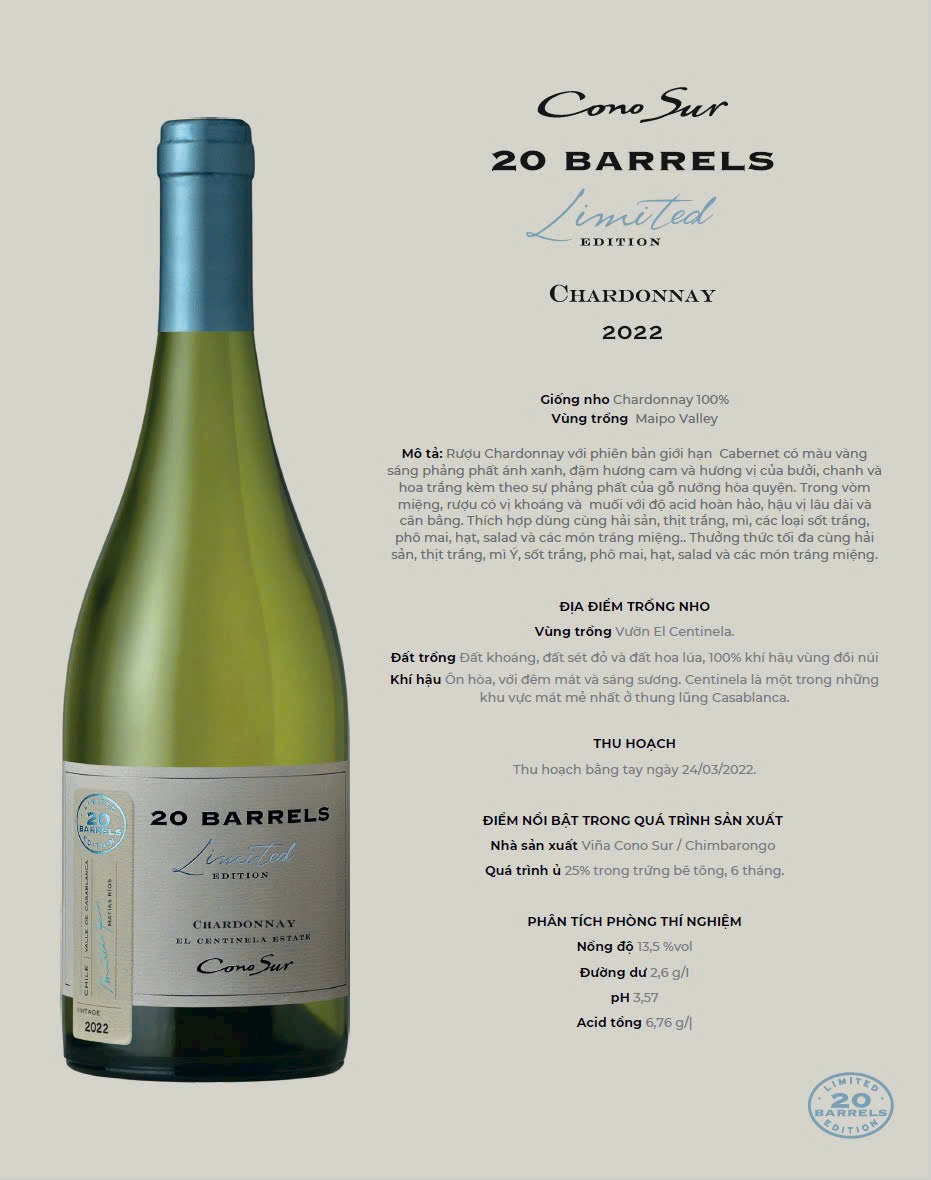 Mô tả: Rượu Chardonnay với phiên bản giới hạn Cabernet có màu vàng sáng phảng phất ánh xanh, đậm hương cam và hương vị của bưởi, chanh và hoa trắng kèm theo sự phảng phất của gỗ nướng hòa quyện. Trong vòm miệng, rượu có vị khoáng và muối với độ acid hoàn hào, hậu vị lâu dài và cân bằng. Thích hợp dùng cùng hải sản, thịt trắng, mì, các loại sốt trắng, phô mai, hạt, salad và các món tráng miệ Thưởng thức tối đa cùng hải sản, thịt trắng, mì Ý, sốt trắng, phô mai, hạt, salad và các món tráng miệng.