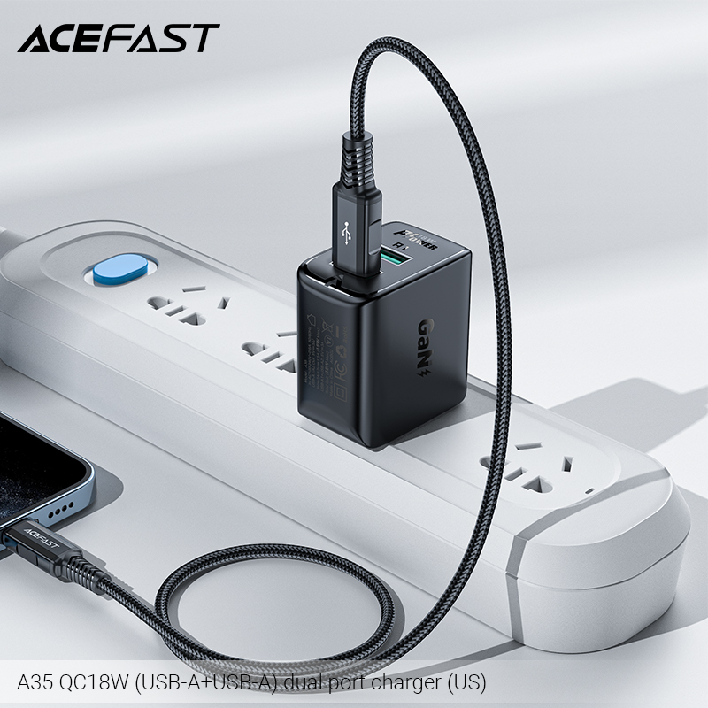 Sạc ACEFAST A35, 2 cổng USB-A QC18W, phích cắm US, hỗ trợ hầu hết các giao thức sạc nhanh. Thông số kỹ thuật: - Chất liệu: PC chống cháy. - Input: AC 100-240V, 0.6A, 50/60Hz, phích cắm US. - Output: Mỗi cổng ra: -