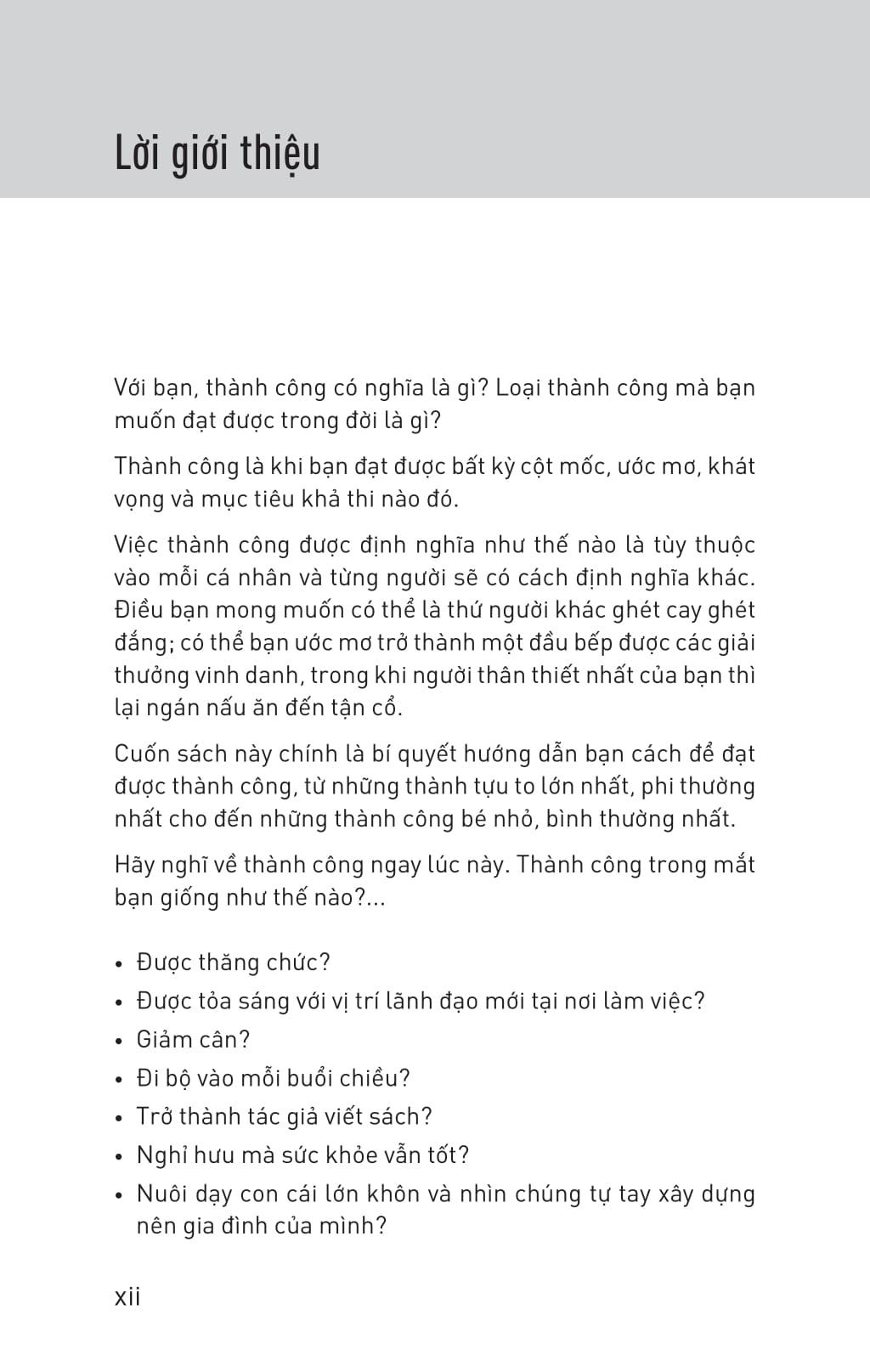 Quyển sách gồm 100 ý tưởng tuyệt vời của tác giả đã trải nghiệm và truyền đạt lại để huấn luyện và giúp mọi người có thể làm việc thông minh và đạt được ước mơ của m.ình để vươn đến thành công. Bạn đọc sẽ khám phá những thói quen phổ biến của những người thành công và tìm ra cách áp dụng chúng trong cuộc sống của chính bạn. Mỗi chương đều có một ý tưởng mới sẽ giúp bạn đọc tiến gần hơn đến mục tiêu của m.ình. Kết hợp các mô tả đơn giản với các hoạt động và bài tập, giúp bạn sẽ học được lối tư duy và thói quen tối ưu cần thiết để thành công trong công việc và cuộc sống.