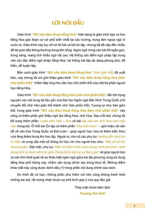 Bên cạnh giáo trình “301 câu đàm thoại tiếng Hoa” (bản giản thể) đã xuất bản, nay chúng tôi xin giới thiệu giáo trình “301 câu đàm thoại tiếng Hoa (bản chữ phồn thể)” nhằm đáp ứng nhu cầu học chữ phồn thể của một bộ phận người học tiếng Hoa.