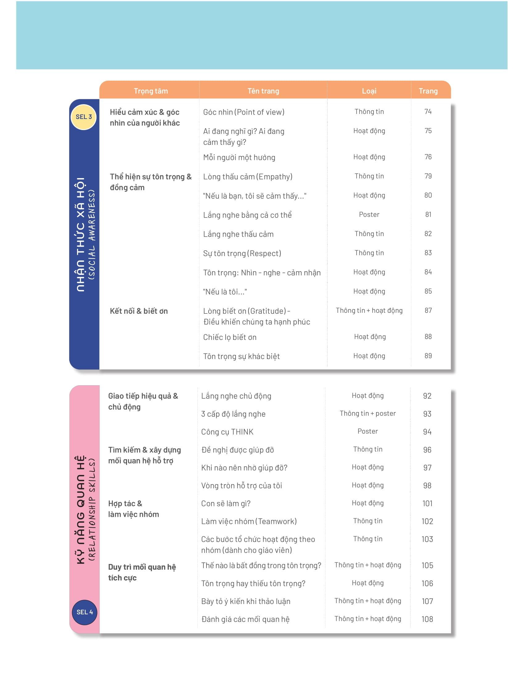 • Chia theo 5 nhóm năng lực cốt lõi của SEL theo mô hình CASEL 5 gồm: Nhận thức bản thân, Quản lý bản thân, Kỹ năng quan hệ, Nhận thức xã hội, Ra quyết định có trách nhiệm