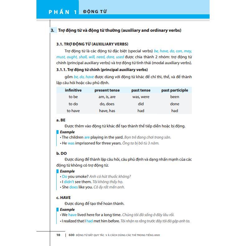 Cuốn 600 động từ bất quy tắc và các dùng các thì trong tiếng Anh rất quan trọng, giúp bạn chia động từ đúng với các thì tương ứng, từ đó làm bài tập, bài kiểm tra tiếng Anh hiệu quả. Nếu nắm vững bảng động từ bất quy tắc này, các bạn sẽ làm bài kiểm tra, bài thi tiếng Anh nhanh chóng và thuận tiện. Nội dung chính của cuốn sách gồm 6 phần: