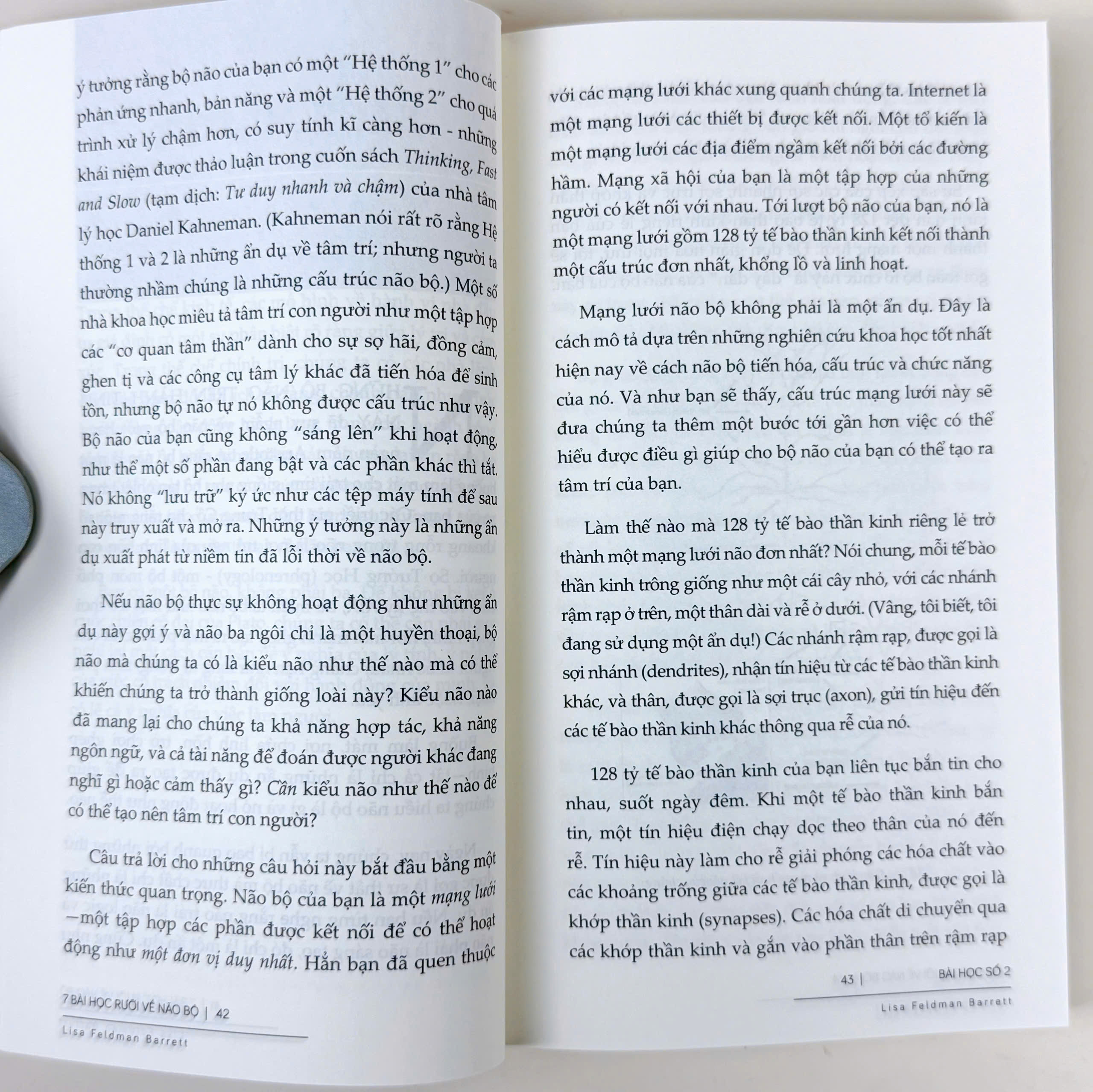 Cuốn sách “7 Bài Học Rưỡi Về Não Bộ” của tác giả Lisa Feldman Barrett mang đến những khám phá thú vị và dễ tiếp cận về khoa học thần kinh. Qua các chương ngắn gọn, tác giả không chỉ giải thích cách bộ não con người vận hành mà còn giúp người đọc hiểu sâu hơn về bản chất con người qua lăng kính của khoa học. Barrett trình bày rằng não bộ của chúng ta không tiến hóa để suy nghĩ, mà thay vào đó, nhiệm vụ chính của nó là quản lý nguồn lực cơ thể và dự đoán nhu cầu năng lượng, từ đó quyết định hành động hiệu quả nhất giúp chúng ta sinh tồn.
