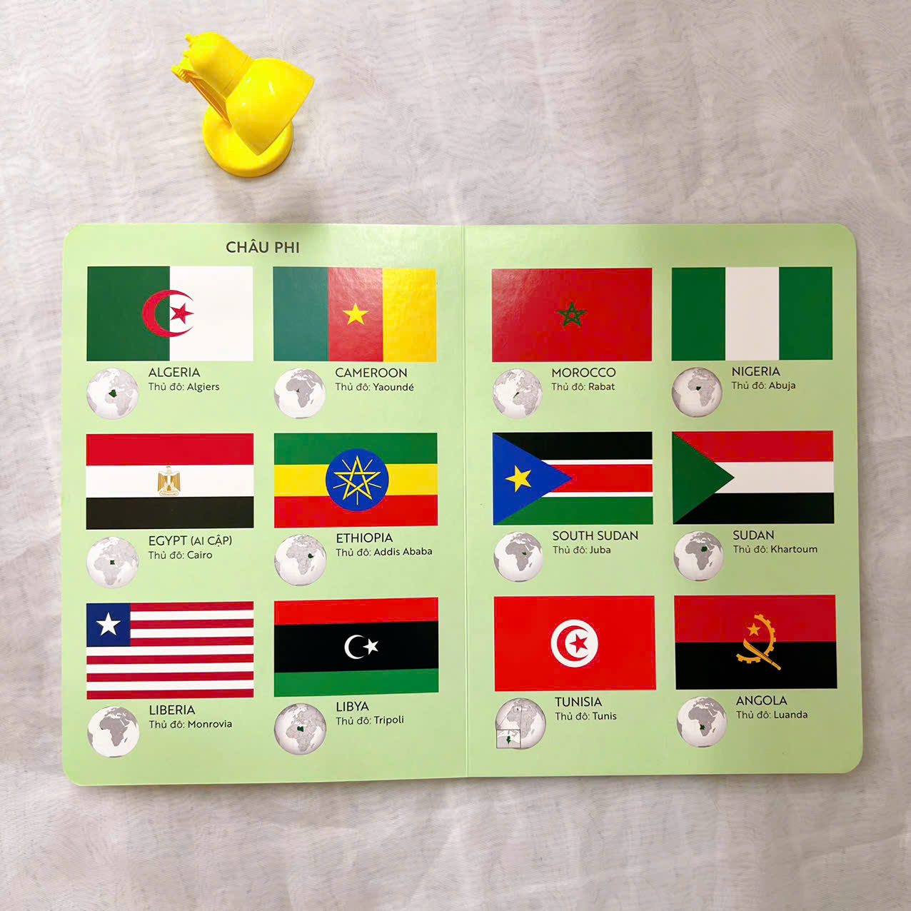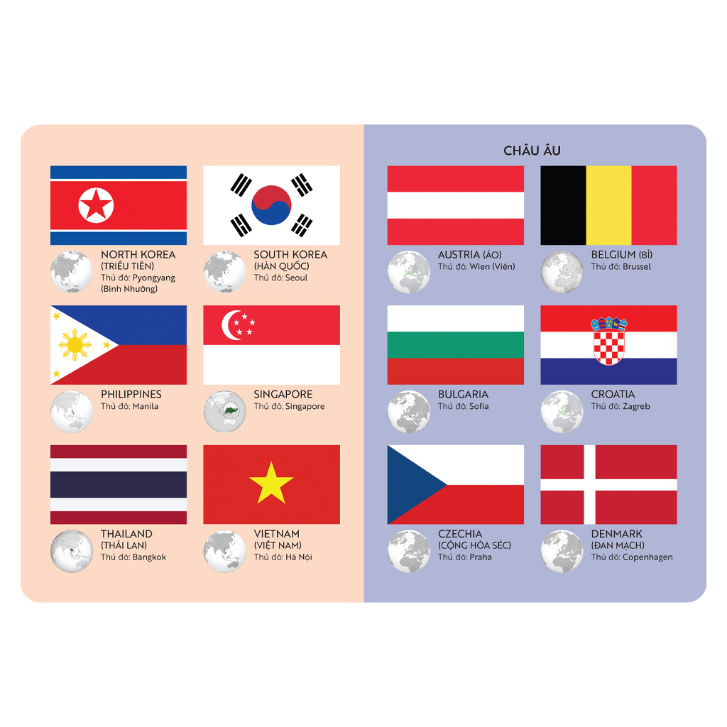 Cuốn sách dày 20 trang được in hoàn toàn bằng giấy bồi cứng giúp bé mở rộng vốn hiểu biết, nhận diện quốc kỳ, vị trí địa lý, tên gọi, thủ đô của hơn 100 quốc gia.
