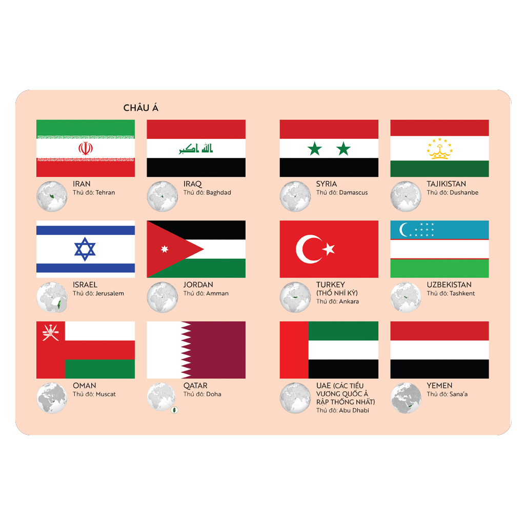 Cuốn sách dày 20 trang được in hoàn toàn bằng giấy bồi cứng giúp bé mở rộng vốn hiểu biết, nhận diện quốc kỳ, vị trí địa lý, tên gọi, thủ đô của hơn 100 quốc gia.