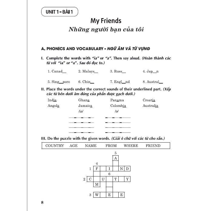 A. Phonics and Vocabulary: Các bài tập trong phần này giúp các em làm quen với cách phát âm và ghi nhớ các từ vựng mới.