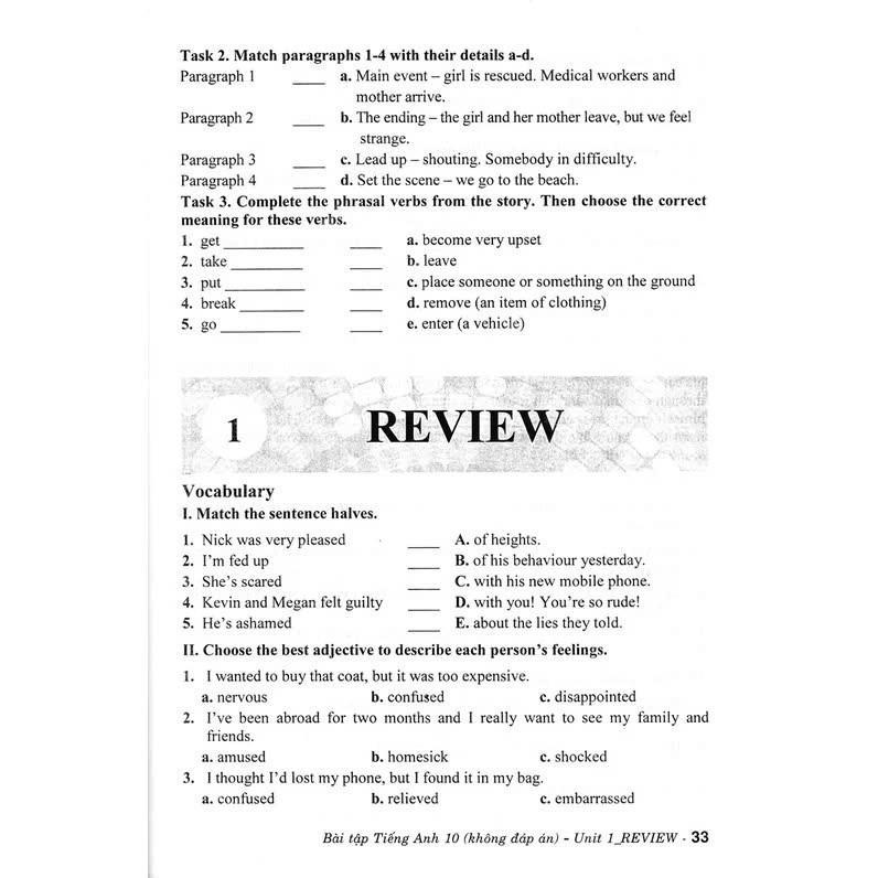 Bài Tập Tiếng Anh Lớp 10 - Không Đáp Án (Theo Chương Trình GDPT Mới) gồm một bài ôn tập củng cố kiến thức đã học (Introduction), và 8 đơn vị bài học chính: Feelings, Adventure, On screen, Our planet, Ambition, Money, Tourism, Science, và sau mỗi đơn vị bài học đều có bài ôn tập Review.