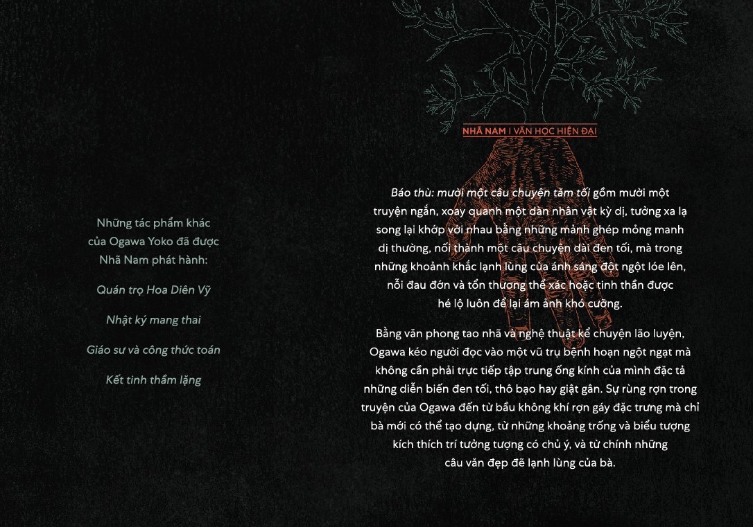 Báo thù: mười một câu chuyện tăm tối gồm mười một truyện ngắn, xoay quanh một dàn nhân vật kỳ dị, tưởng xa lạ song lại khớp với nhau bằng những mảnh ghép mỏng manh dị thường, nối thành một câu chuyện dài đen tối, mà trong những khoảnh khắc lạnh lùng của ánh sáng đột ngột lóe lên, nỗi đau đơn và tổn thương thể xác hoặc tinh thần được hé lộ luôn để lại ám ảnh khó cưỡng.