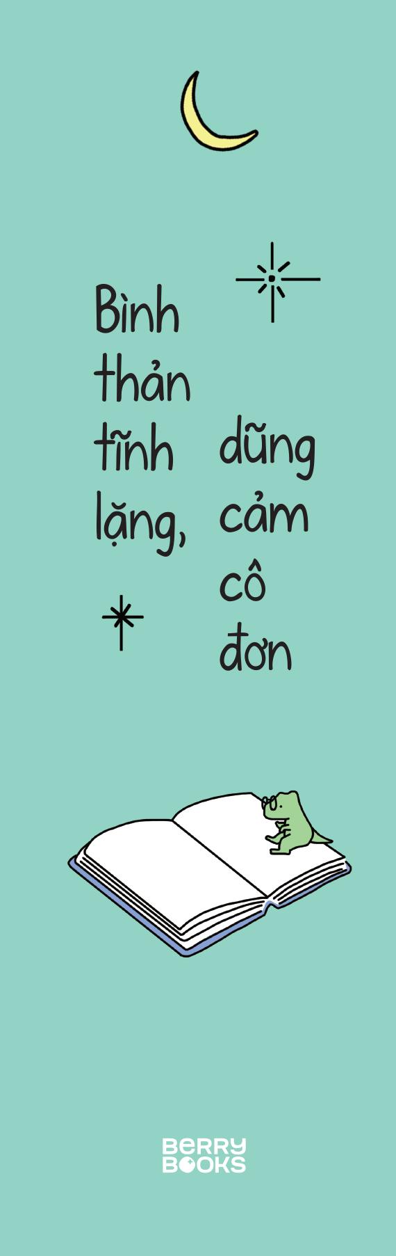 Bình Thản Tĩnh Lặng, Dũng Cảm Cô Đơn Con khủng long cuối cùng còn sót lại trên Trái Đất đã cảm thấy thế nào nhỉ? Nó cảm thấy như m.ình có cả thế giới hay là cảm thấy như bị thế giới bỏ rơi? Nó vô cùng cô đơn hay đang sống dũng cảm ở một khoảng cách thích hợp với những sinh vật không phải khủng long? Bạn biết không, nếu có một ngày Trái Đất chỉ còn lại mỗi m.ình bạn, có lẽ bạn lại nhận ra rằng từ trước đến giờ m.ình chưa từng cô đơn. Vậy nên trong thời đại mà con người đang kết nối quá mức với nhau này, nếu bạn thích ở một m.ình thì cũng chẳng sao cả, cứ bình thản mà tĩnh lặng, dũng cảm mà cô đơn...