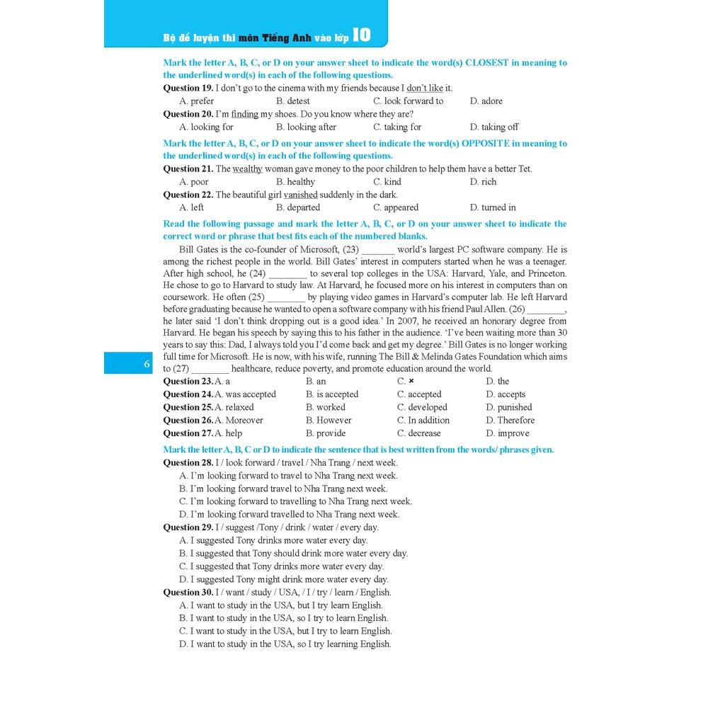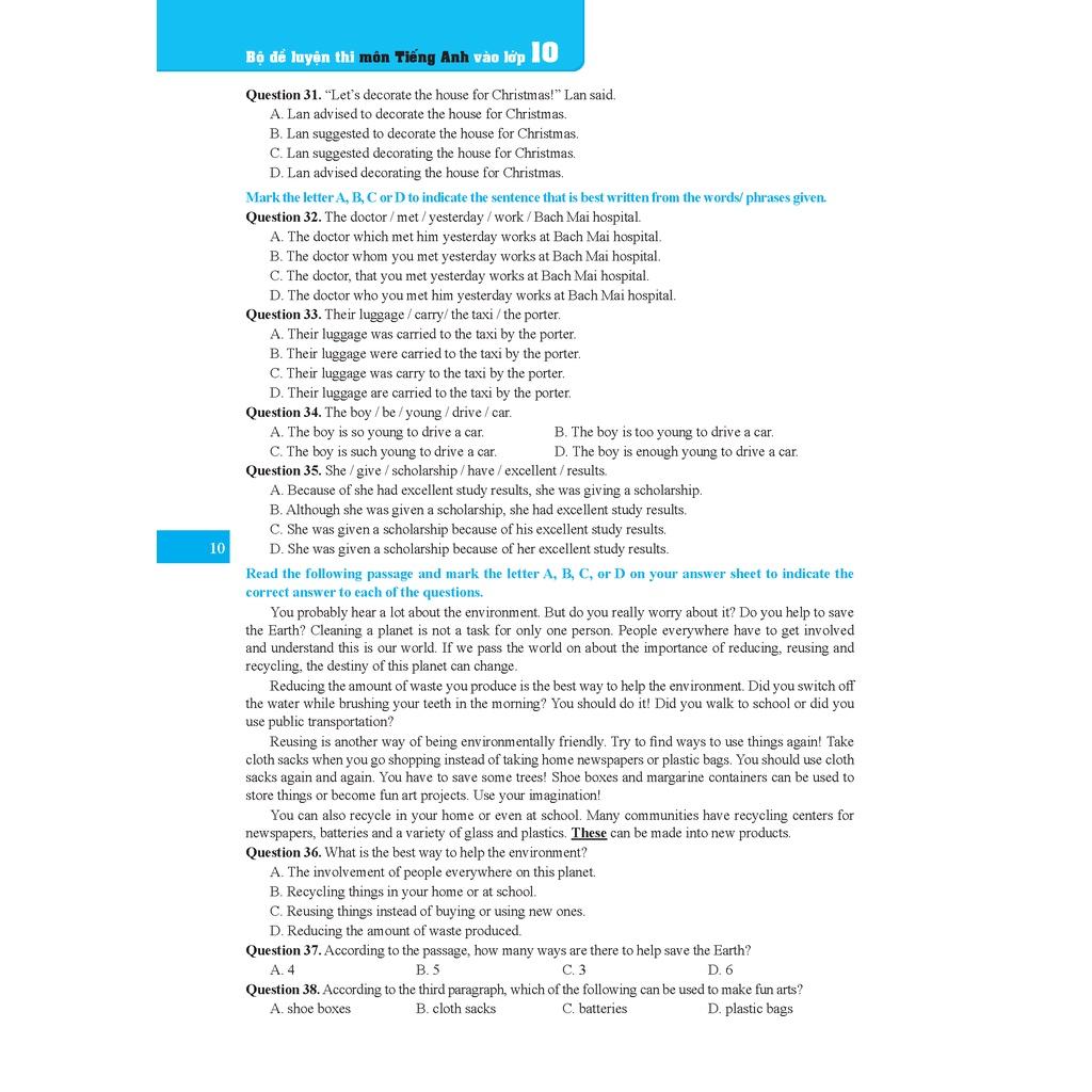 Cuốn sách “Bộ đề luyện thi môn Tiếng Anh vào lớp 10” được các tác giả biên soạn sẽ giúp các em học sinh lớp 9, những người chuẩn bị vượt vũ môn để vào được ngôi trường Trung học phổ thông mơ ước, có cái nhìn tổng thể về cấu trúc đề thi, làm quen với các dạng bài thi, ôn luyện kiến thức và bứt phá điểm thi trong giai đoạn nước rút. Ngoài ra, cuốn sách còn có thể làm nguồn tài liệu ôn tập, tham khảo tin cậy dành cho giáo viên, quý phụ huynh và các em học sinh các khối lớp khác.