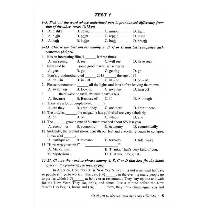 Để giúp các em học sinh lớp 9 có thêm tài liệu để luyện tập, củng cố, và hệ thống các kiến thức cơ bản trong chương trình Tiếng Anh lớp 9, chuẩn bị cho kì thi Tuyển sinh vào lớp 10 Trung học phổ thông, chúng tôi biên soạn cuốn Bộ Đề Thi Tuyển Sinh Vào Lớp 10 Môn Tiếng Anh.