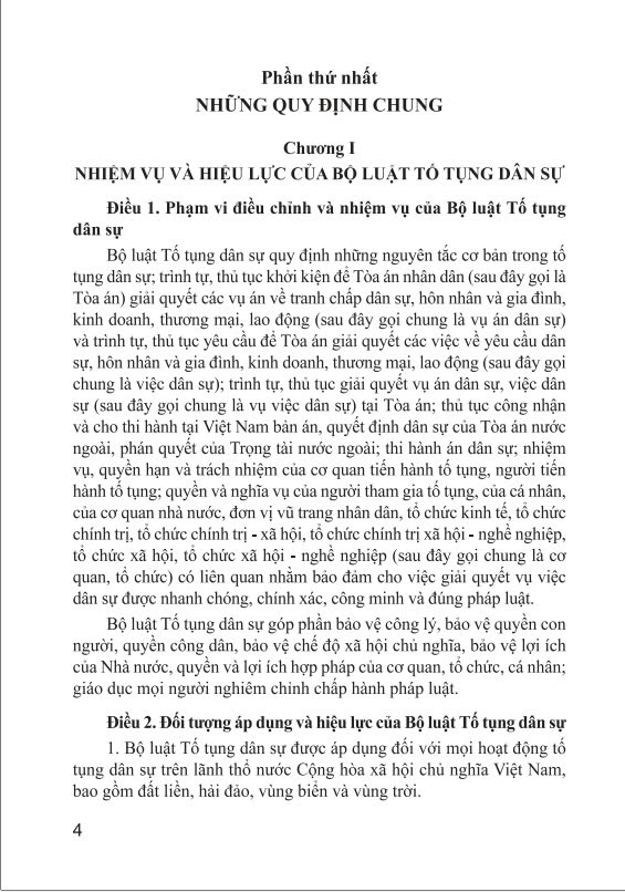 NHIỆM VỤ VÀ HIỆU LỰC CỦA BỘ LUẬT TỎ TỤNG DÂN SỰ Điều 1. Phạm vi điều chỉnh và nhiệm vụ của Bộ luật Tố tụng dân sự