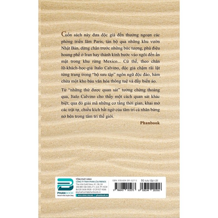 Cuốn sách này đưa độc giả đến thưởng ngoạn các phòng triển lãm Paris, tản bộ qua những khu vườn Nhật Bản, dưng chân trước những bức tượng, phù điêu hoang phế ở Iran hay thành kính bước vào ngôi đền ẩn mật trong khu rừng Mexico... Cứ thế, theo chân lữ khách học giả Italo Calvino, độc giả chậm rãi lật từng trang trong "bộ sưu tập" ngôn ngữ độc đáo, hàm chứa một kho báu văn hóa thông tuệ và đầy biến ảo.