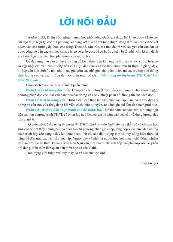 Để đáp ứng nhu cầu ôn luyện, củng cố kiến thức, rèn kĩ năng và thử sức trước kì thi, trên cơ sở cập nhật các văn bản hướng dẫn của Bộ Giáo dục và Đào tạo, cũng như từ thực tế giảng dạy, hướng dẫn học sinh ôn tập, nhóm tác giả gồm các nhà giáo đang làm việc tại các trường phổ thông chất lượng cao và các trường đại học biên soạn bộ sách: Cẩm nang ôn luyện thi THPT, đại học môn Ngữ văn.