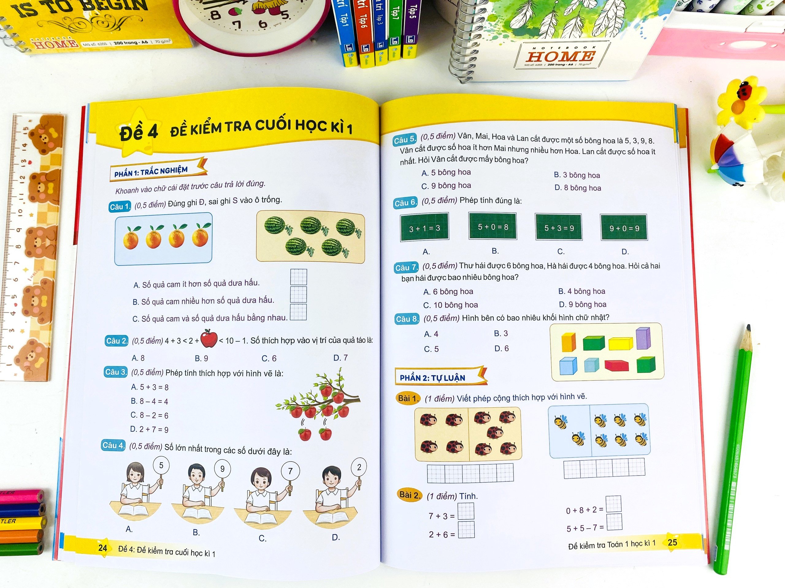 " ĐỀ KIỂM TRA TOÁN 1 HỌC KÌ 1 VÀ HỌC KÌ 2". Nội dung mỗi cuốn sách chia theo 20 đề ôn luyện. Câu trúc gồm 2 phần: