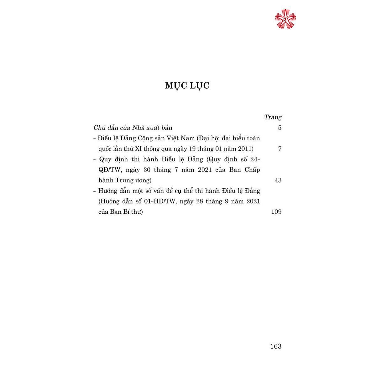 Nội dung cuốn sách gồm: Điều lệ Đảng Cộng sản Việt Nam (Đại hội đại biểu toàn quốc lần thứ XI thông qua ngày 19 tháng 01 năm 2011); Quy định thi hành Điều lệ Đảng (Quy định số 24-QĐ/TW, ngày 30 tháng 7 năm 2021 của Ban Chấp hành Trung ương); Hướng dẫn một số vấn đề cụ thể thi hành Điều lệ Đảng (Hướng dẫn số 01-HD/TW, ngày 28 tháng 9 năm 2021 của Ban Bí thư).