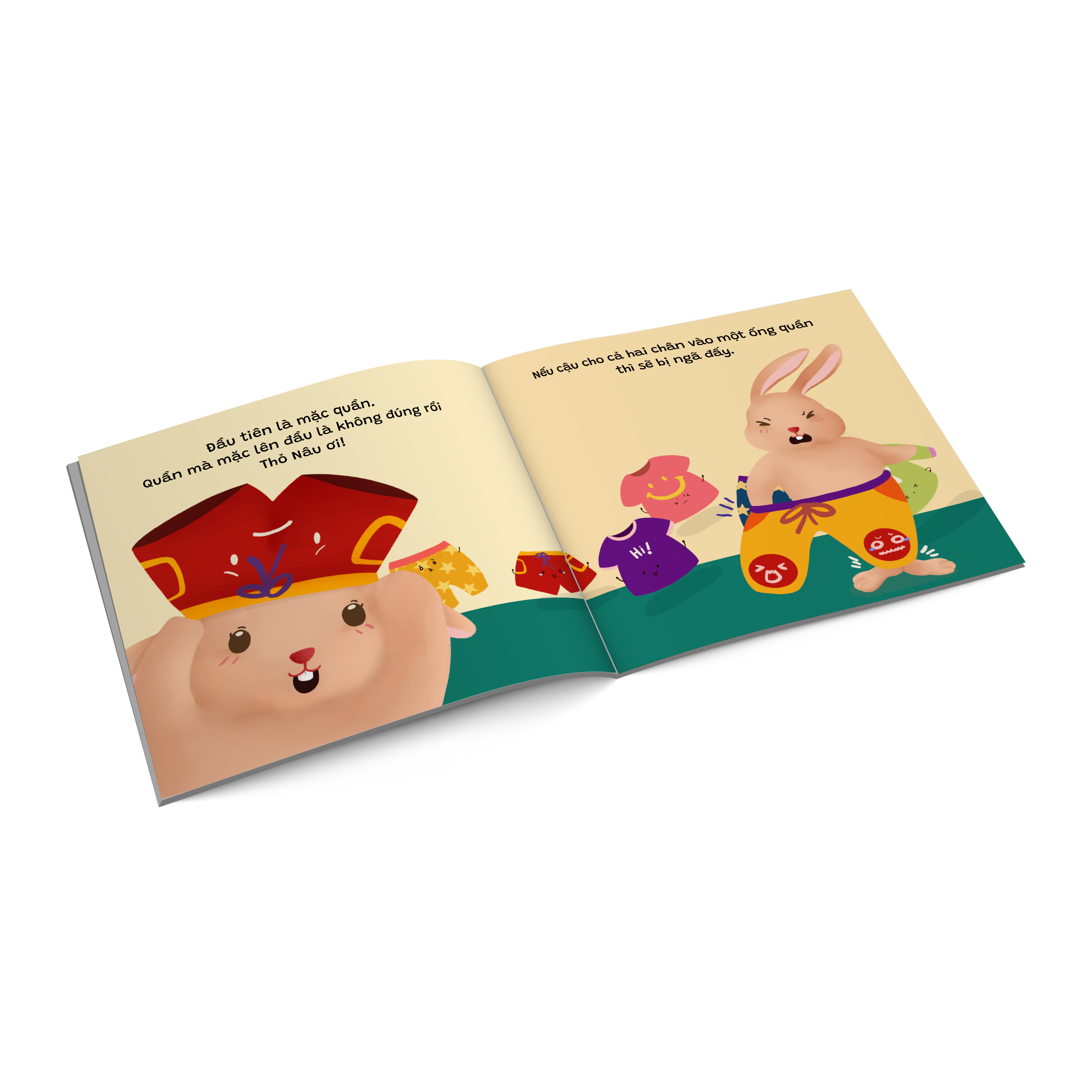 Thỏ con nói với mẹ rằng bạn ấy đã lớn và sẽ tự mặc quần áo. Mẹ rất vui và tin rằng Thỏ con sẽ làm được. Lúc đầu Thỏ con còn khá lúng túng, vụng về vì không biết mặc như thế nào mới đúng nên cho cả hai chân vào một ống quần. Thỏ con còn tưởng rằng mặc quần cũng như mặc áo nên xỏ chân vào cổ áo nữa. Nhưng sau đó Thỏ con được các bạn quần áo cổ vũ nên đã tự mặc đúng quần áo đấy. Thỏ con thật là giỏi phải không?