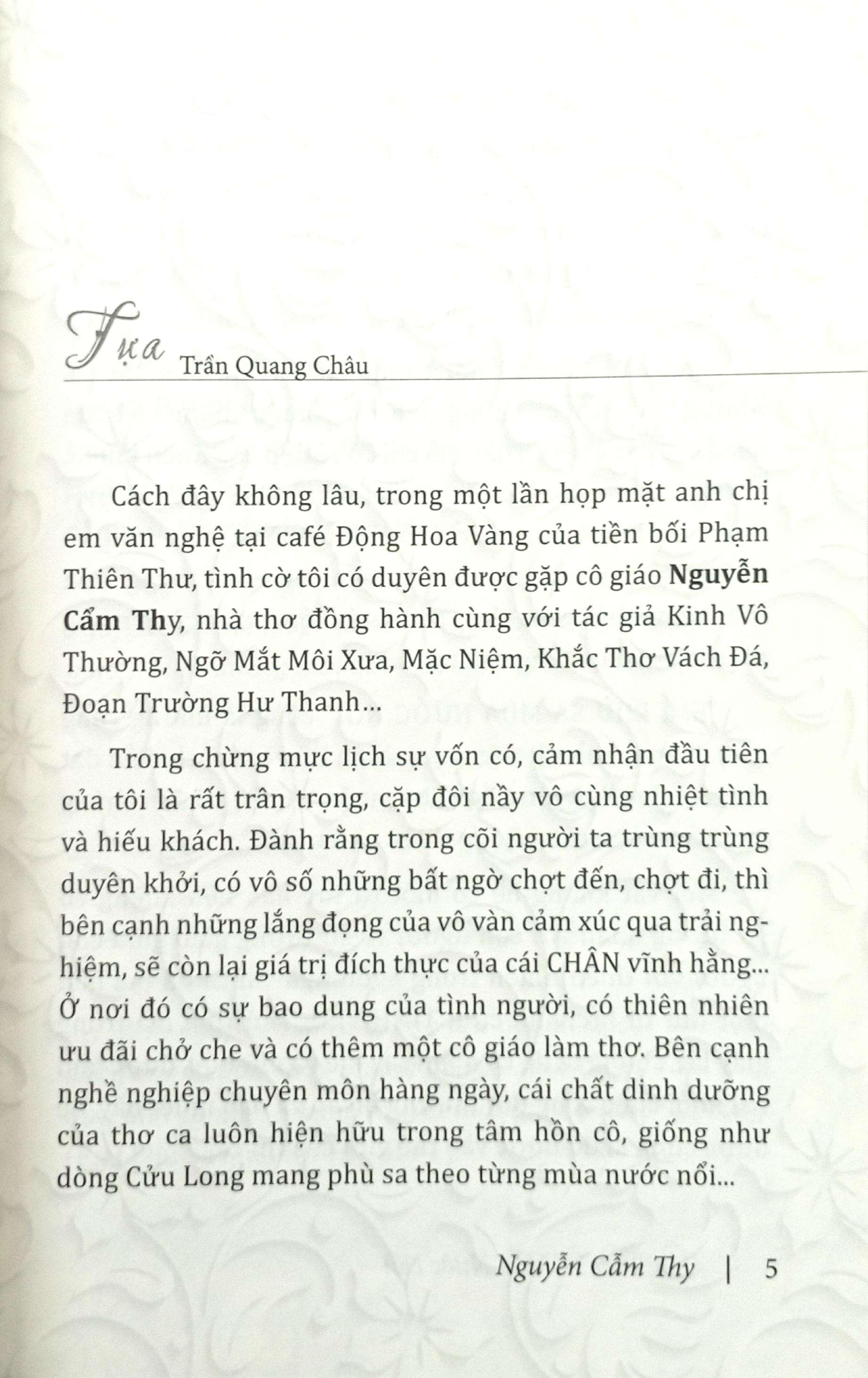 Cách đây không lâu, trong một lần họp mặt anh chị em văn nghệ tại café Động Hoa Vàng của tiền bối Phạm Thiên Thư, tình cờ tôi có duyên được gặp cô giáo Nguyễn Cẩm Thy, nhà thơ đồng hành cùng với tác giả Kinh Vô Thường, Ngỡ Mắt Môi Xưa, Mặc Niệm, Khắc Thơ Vách Đá, Đoạn Trường Hư Thanh...