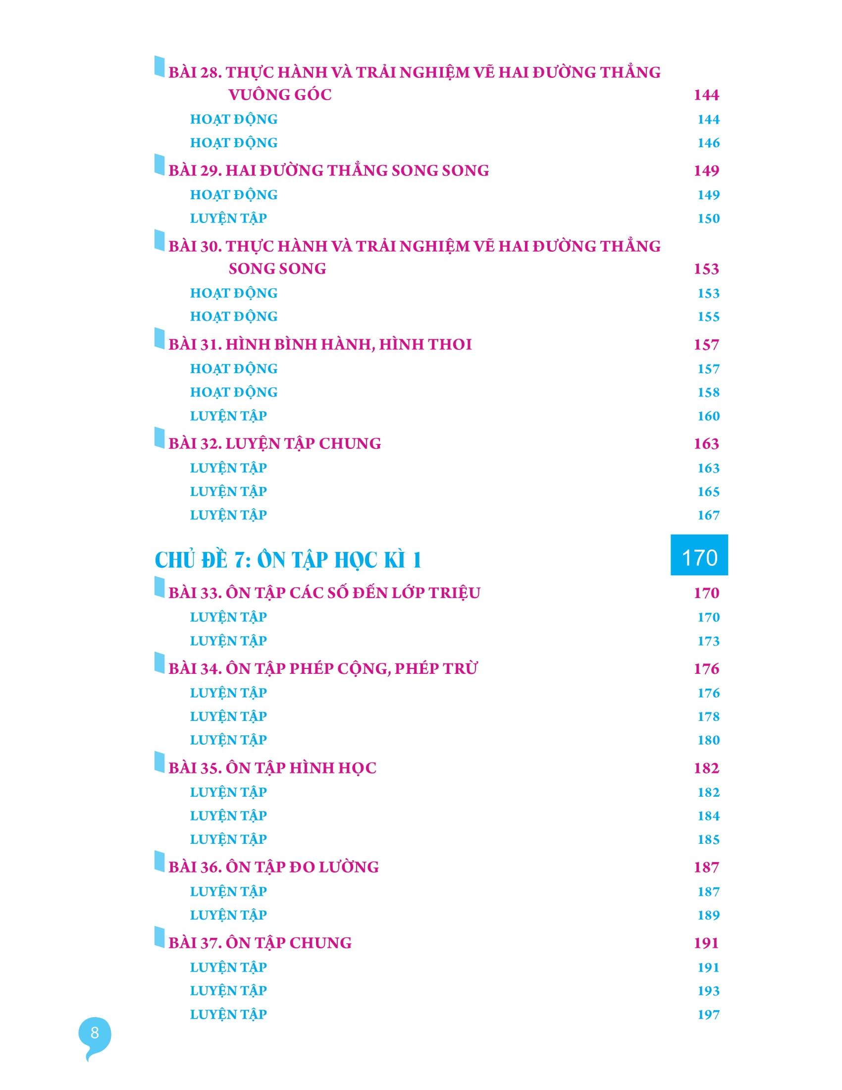 Bộ sách Giải bài tập toán được biên soạn trên cơ sở sách giáo khoa Kết nối tri thức với cuộc sống từ lớp 1 đến lớp 5. Bộ sách này không chỉ giúp các em nắm vững kiến thức cơ bản mà còn phát triển tư duy, khả năng sáng tạo và kĩ năng giải quyết vấn đề thông qua những bài toán thú vị và thực tiễn. Trong cuốn sách này sẽ có 37 bài tập được chia thành 7 chủ đề: - Chủ đề 1: Ôn tập các số đến 100 000 - Chủ đề 2: Góc và đơn vị đo góc - Chủ đề 3: Số có nhiều chữ số - Chủ đề 4: Một số đơn vị đo đại lượng - Chủ đề 5: Phép cộng và phép trừ - Chủ đề 6: Đường thẳng vuông góc. Đường thẳng song song - Chủ đề 7: Ôn tập học kì 1 Mỗi bài toán trong bộ sách giáo khoa toán Kết nối tri thức với cuộc sống đều được chúng tôi giải rõ ràng và dễ hiểu, để các em học sinh có thể hiểu sâu hơn về bài toán, nắm vững kiến thức và vận dụng nhuần nhuyễn trong tương lai. Chúng tôi tin rằng việc này sẽ giúp các em hứng thú hơn với môn học, tìm được nhiều điều hữu ích và niềm vui trong quá trình học tập. Chúng tôi hi vọng rằng cuốn sách này sẽ là người bạn đồng hành đáng tin cậy của các em học sinh trên con đường chinh phục kiến thức toán học. Chúng tôi cũng mong rằng quý thầy cô và cha mẹ sẽ tìm thấy ở đây những phương pháp giảng dạy và hỗ trợ học tập hữu ích, giúp các em học sinh phát triển toàn diện về cả năng lực và phẩm chất