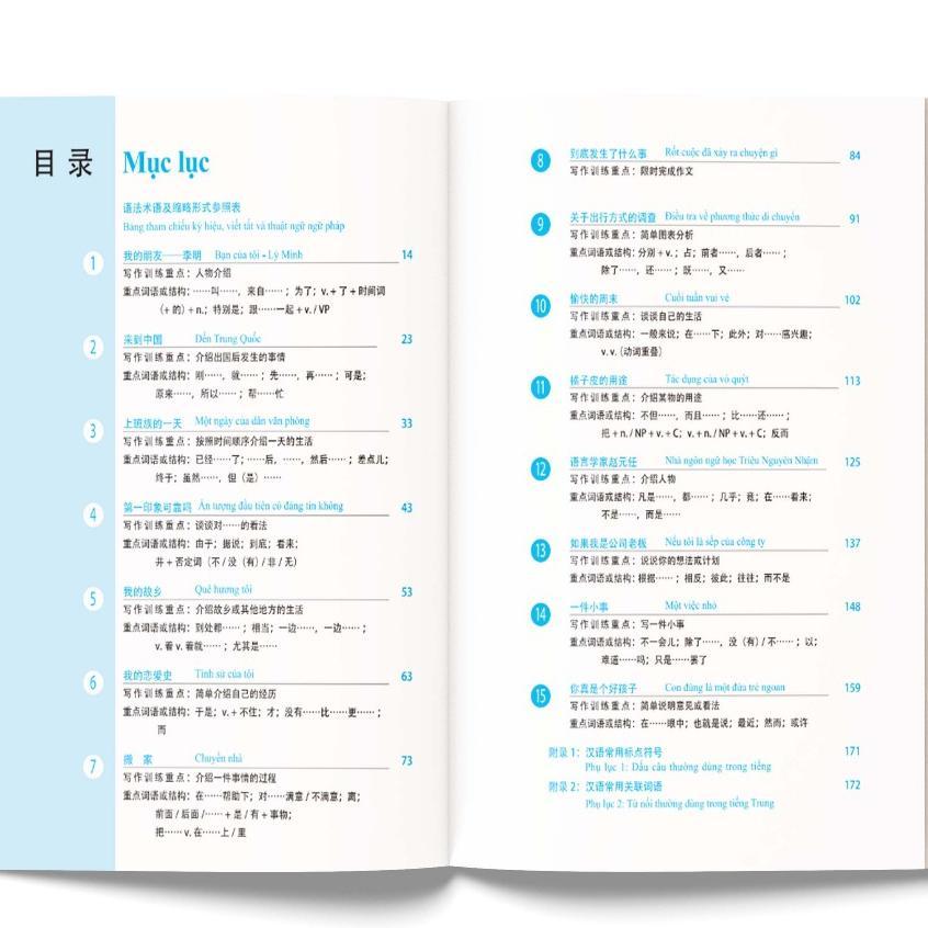 Giáo Trình Phát Triển Hán Ngữ Viết Trung Cấp 2 bao gồm 15 bài học, mỗi bài được thiết kế để rèn luyện kỹ năng viết thông qua các phần: