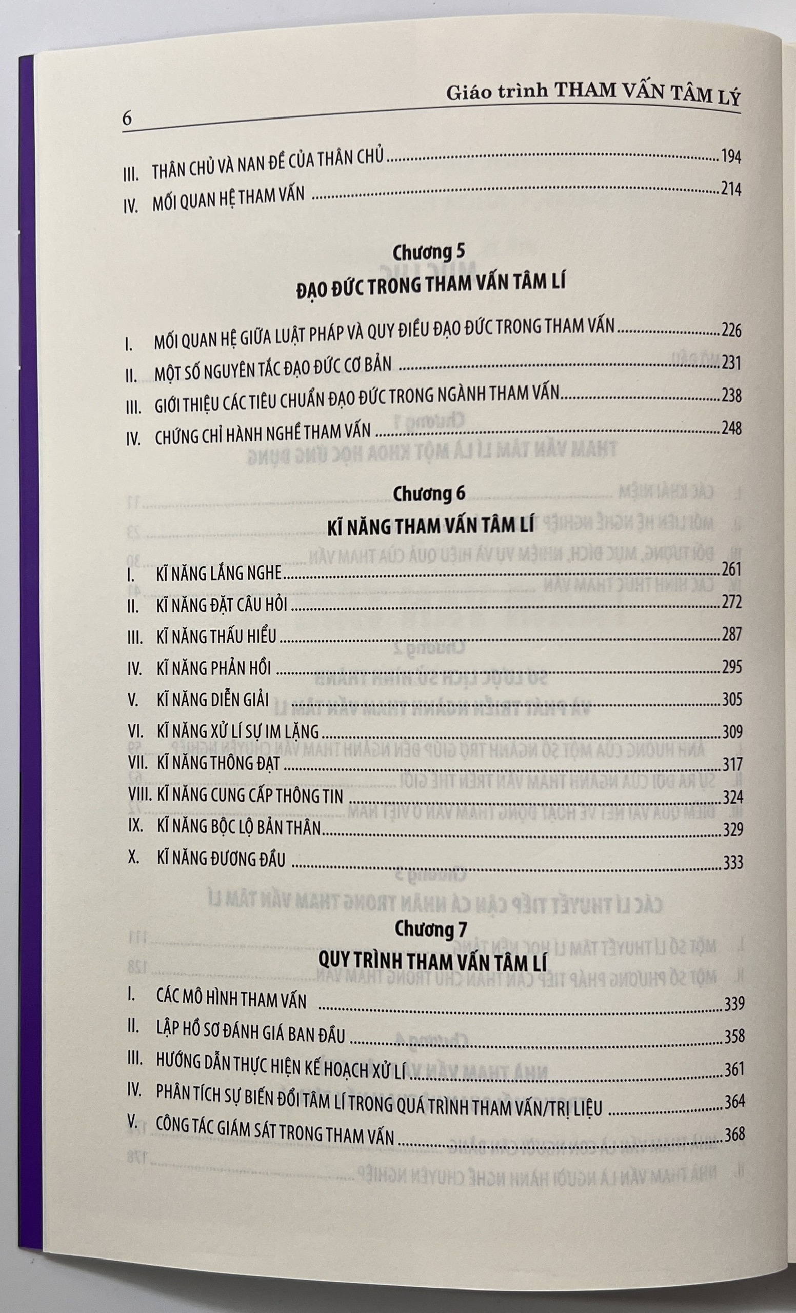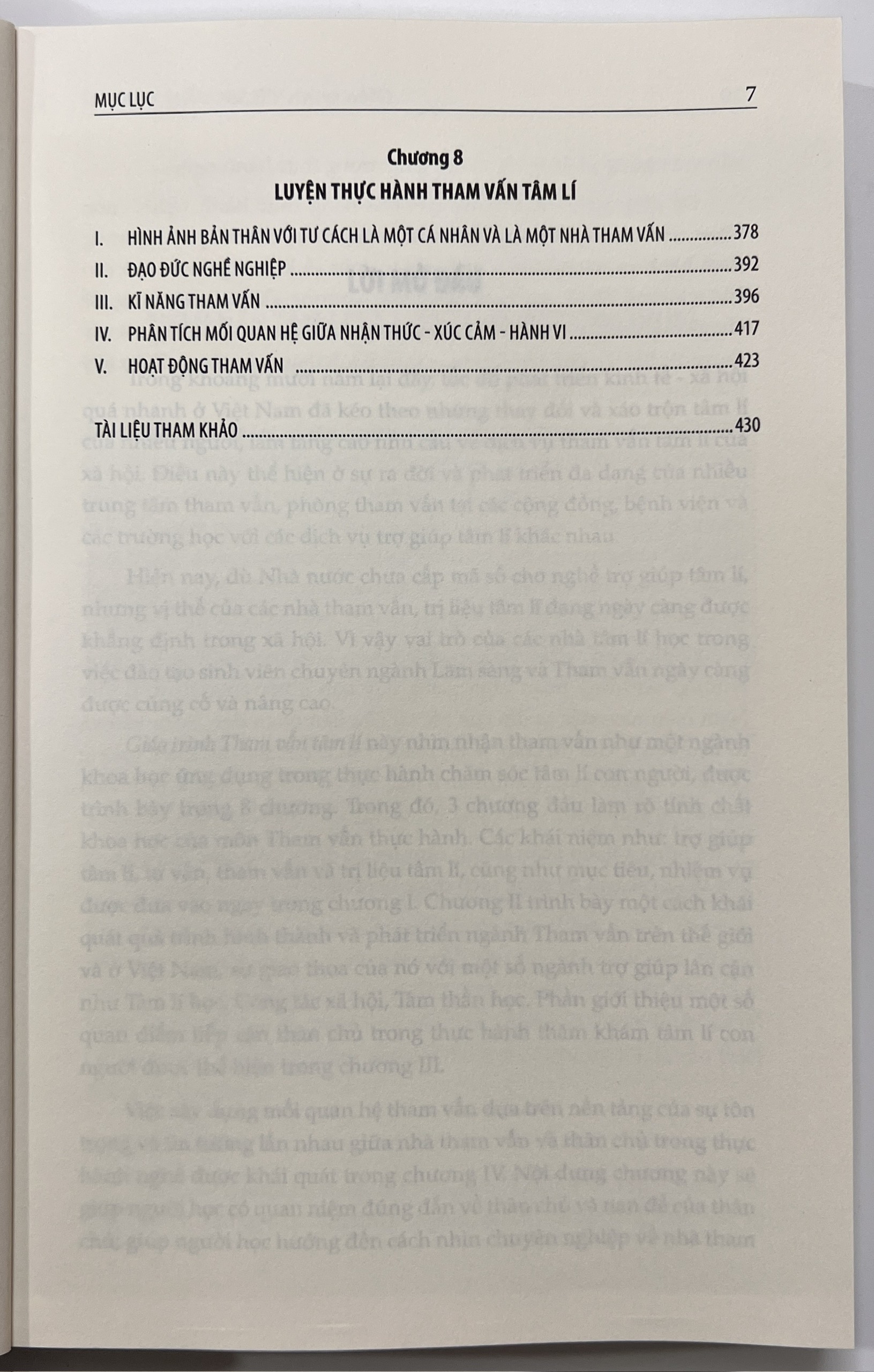 Để giúp người học nâng cao khả năng thực hành nghề, cuốn Tham vấn tâm lí giới thiệu những khía cạnh đạo đức và pháp lí trong thực hành ca (chương V), hướng dẫn một số kĩ năng tham vấn căn bản (chương VI) và quy trình tham vấn (chương VII). Và cuối cùng, để củng cố những tri thức tiếp thu được qua mỗi chương, chúng tôi xây dựng các bài tập tình huống trong thực hành tham vấn tâm lí. Điều này thể hiện trong chương VIII.