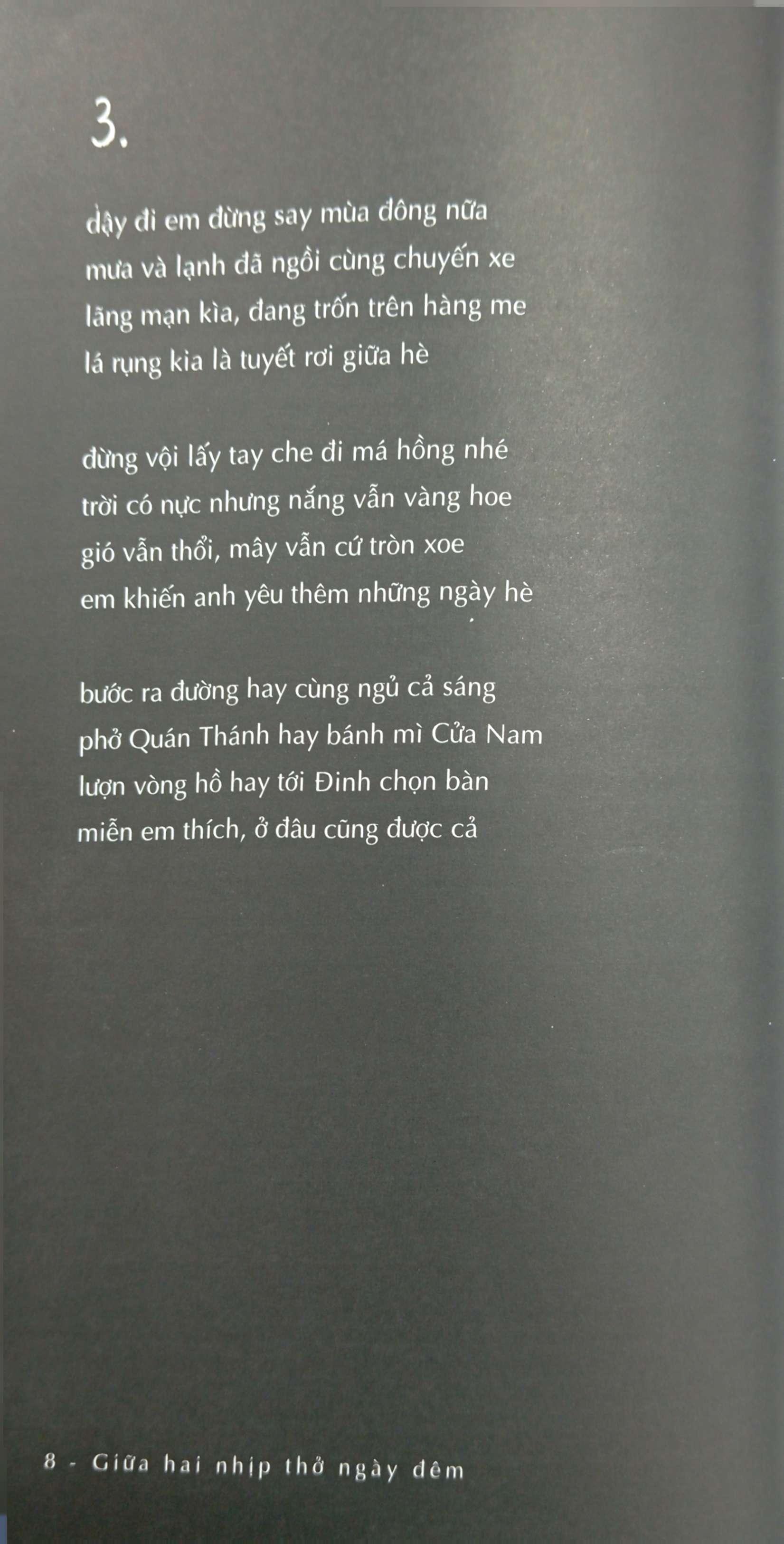 Giữa Hai Nhịp Thở Ngày Đêm Tôi là người có rất nhiều những cuộc hẹn gấp, mà đa số lời mời toàn đến từ chính bản thân tôi. Hôm qua tình cảm vỡ vụn, hẹn tôi đau buồn gấp. Sáng nay tin báo trượt rủ tôi quay về với ủ dột thường niên. Tới mai chắc chắn bản thân tôi sẽ tự hẹn m.ình ở một vùng đất mà tôi sẽ luôn luôn là người thất bại và yếu kém trong bất cứ điều gì… “kim đồng hồ quét còn lại sau cuối anh đã quên, tất cả cũng đã quên ta đã khóc không vì lí do gì và đã khóc vì những điều đã hết anh sẽ gỡ hết giọt nắng xuống để chỉ còn mây dại với thời gian để như giông kéo đến trước mưa ngàn để như phút im lặng trước lần cuối” Khoảng luân phiên giữa mặt trăng và mặt trời luôn là lúc mà tôi cảm thấy bản thân m.ình đủ cô độc để bước vào, trò chuyện và hòa giải với chúng. Có lẽ, những gì diễn ra giữa ngày và đêm luôn là một thứ gì đó mà chẳng ai có thể hiểu rõ được. Hoặc đơn giản hơn, chúng cố tình để bản thân ta lúc đó không thể hiểu được. Những câu thơ trong “Giữa hai nhịp thở ngày đêm” có thể diễn giải trăn trở sâu thẳm trong nội tâm cậu. Chúng cho phép cậu lắng nghe, vỗ về, đối thoại, thậm chí tranh cãi hay giằng xé với chính m.ình. Nhưng dù là thấu hiểu hay đấu tranh, tất cả đều diễn ra từ chính tâm hồn cậu - nơi cậu không cần phải trốn chạy hay trông chờ vào sự cứu rỗi từ bất kỳ ai khác.