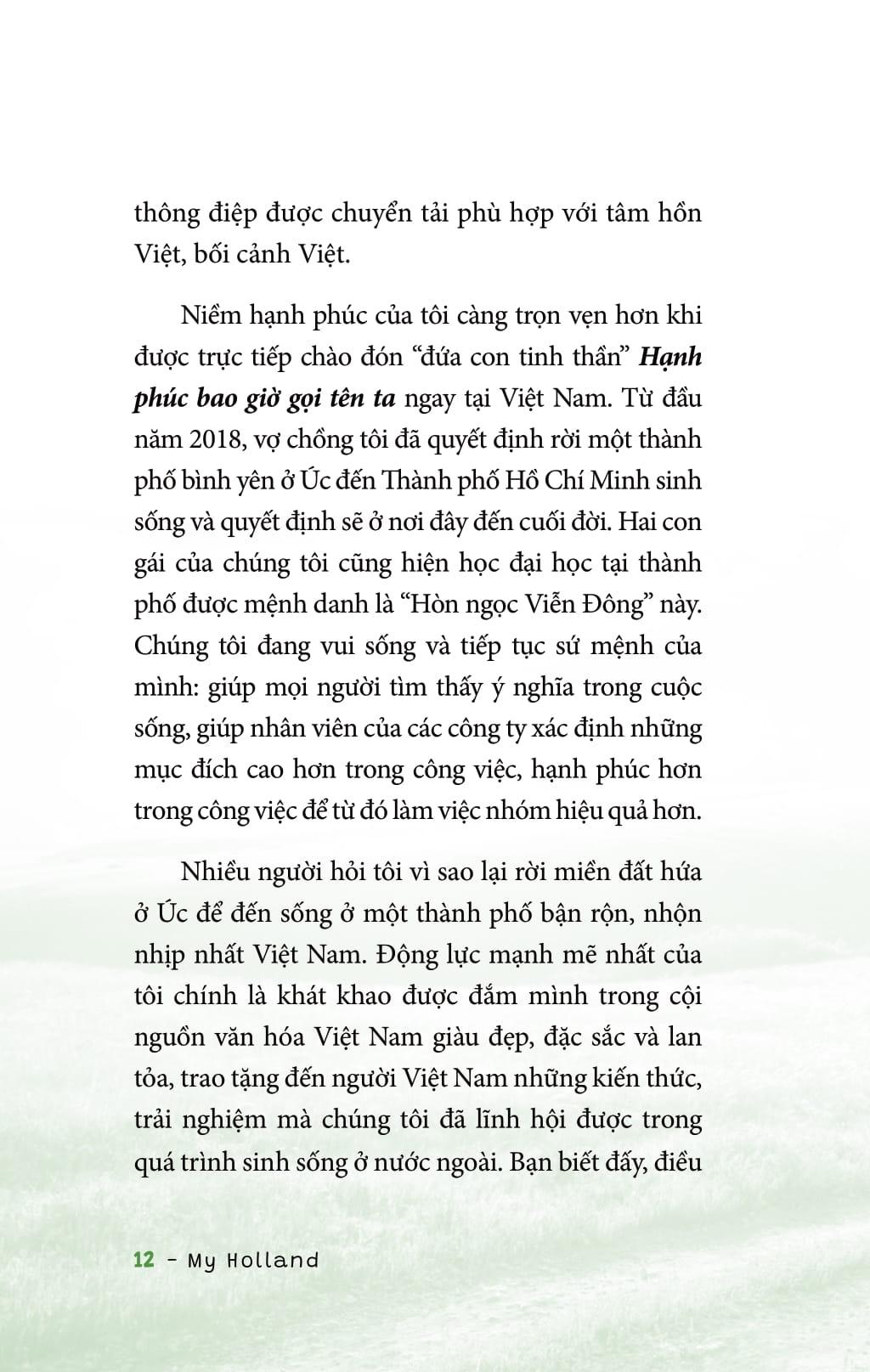 Cuốn sách "Hạnh Phúc Bao Giờ Gọi Tên Ta" của tác giả My Holland là một hành trình khám phá sâu sắc về khái niệm hạnh phúc và cách để từng bước xây dựng nó trong cuộc sống hằng ngày. Được viết bằng giọng văn chân thành, gần gũi, cuốn sách không chỉ mang đến những lý thuyết về tâm lý học mà còn là những trải nghiệm thực tế, bài học quý giá từ chính cuộc sống của tác giả.