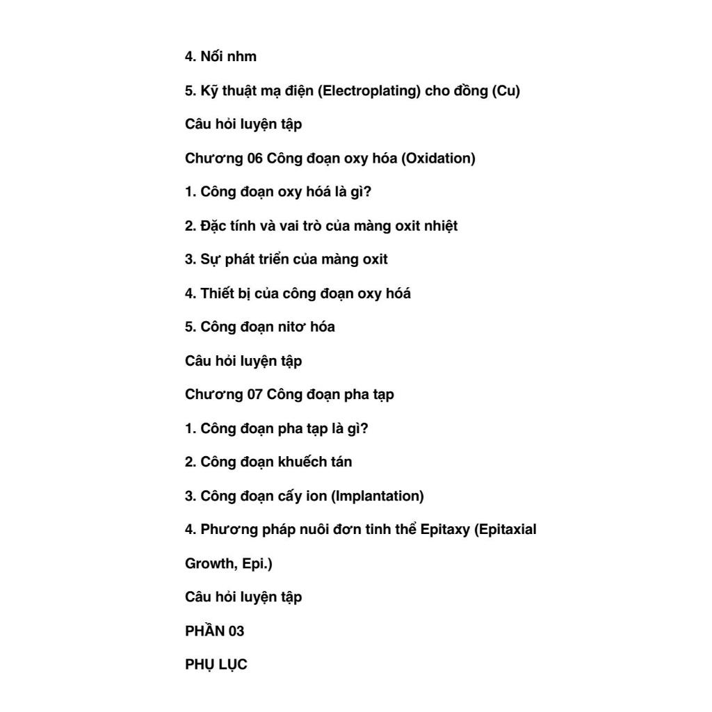 Phần hai, Công đoạn chế tạo bán dẫn, đi sâu vào chi tiết từng bước trong quy trình sản xuất, từ các khái niệm cơ bản đến các công nghệ tiên tiến. Người đọc sẽ được tìm hiểu về các quy trình quan trọng như quang khắc, ăn mòn, màng mỏng, nối dây kim loại, ôxy hóa, pha tạp, đánh bóng cơ-hóa và làm sạch. Mỗi công đoạn được trình bày một cách dễ hiểu, từ lý thuyết đến thực tế, giúp độc giả có thể nắm bắt được những khía cạnh phức tạp và tinh vi của công nghệ chế tạo bán dẫn hiện đại.