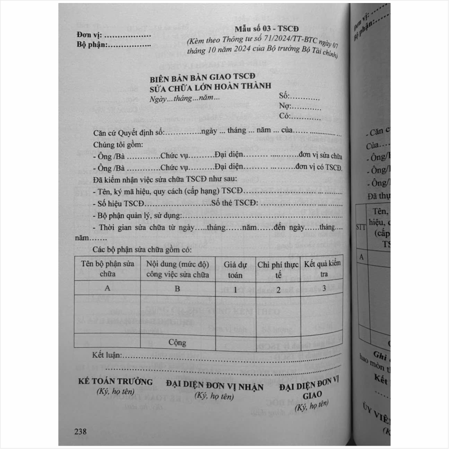 - Toàn bộ sách bìa mềm khổ lớn 19 x 27 cm phân phối bởi Nhà sách Nam Việt đều được bọc sách Plastic MIỄN PHÍ và xuất hóa đơn điện tử đầy đủ, nhanh chóng. …//… Lời giới thiệu: Ngày 07 tháng 10 năm 2024, Bộ Tài chính đã chính thức ban hành Thông tư số 71/2024/TT-BTC hướng dẫn Chế độ kếtoán hợp tác xã, liên hiệp hợp tác xã. Nhằm hướng dẫn về chứng từ kế toán, tài khoản kế toán, nguyên tắc ghi sổ kế toán, lập và trình bày Báo cáo tài chính của hợp tác xã, liên hiệp hợp tác xã; không áp dụng cho việc xác định nghĩa vụ thuế của hợp tác xã đối với ngân sách Nhà nước. Việc ghi sổ kế toán phải căn cứ vào các chứng từ kế toán được phản ánh trên cơ sở các giao dịch kinh tế phát sinh và đã hoàn thành. Hợp tác xã phải tuân thủ các quy định của pháp luật, cơ chế, chính sách liên quan khi thực hiện các giao dịch kinh tế. Nhằm phổ biến đến Quý Cơ quan, Đơn vị và Quý khách hàng thân thiết nắm bắt kịp thời những quy định mới nêu trên. Nhà sách Nam Việt xin trân trọng giới thiệu cuốn sách: Hướng Dẫn Chế Độ Kế Toán Hợp Tác Xã, Liên Hiệp Hợp Tác Xã theo Thông Tư Số 71/2024/TT-BTC ngày 07/10/2024 …//… Nội dung cuốn sách bao gồm những nội dung chính như sau: Chương I. QUY ĐỊNH CHUNG Chương II. QUY ĐỊNH CỤ THỂ Chương III. ĐIỀU KHOẢN THI HÀNH Phụ lục I. DANH MỤC HỆ THỐNG TÀI KHOẢN KẾ TOÁN Phụ lục II. DANH MỤC, BIỂU MẪU VÀ PHƯƠNG PHÁP LẬP CHỨNG TỪ KẾ TOÁN Phụ lục III. DANH MỤC SỔ KẾ TOÁN, BIỂU MẪU SỔ KẾ TOÁN VÀ PHƯƠNG PHÁP GHI SỔ KẾ TOÁN VÀ HÌNH THỨC SỔ KẾ TOÁN Phụ lục IV. BIỂU MẪU BÁO CÁO TÀI CHÍNH, NỘI DUNG VÀ PHƯƠNG PHÁP LẬP, TRÌNH BÀY BÁO CÁO TÀI CHÍNH *** Quý khách hàng hãy an tâm khi mua sách tại Nhà sách Nam Việt, cam kết uy tín, chất lượng, sách bản gốc chuẩn đẹp, được kiểm hàng, hài lòng mới thanh toán, sách đã được bọc plastic cao cấp miễn phí! …//… Cảm ơn các bạn đã ghé thăm shop Nhà sách Nam Việt ! Sách Hướng Dẫn Chế Độ Kế Toán Hợp Tác Xã, Liên Hiệp Hợp Tác Xã theo Thông Tư Số 71/2024/TT-BTC ngày 07/10/2024 Sách Hướng Dẫn Chế Độ Kế Toán Hợp Tác Xã, Liên Hiệp Hợp Tác Xã theo Thông Tư Số 71/2024/TT-BTC ngày 07/10/2024