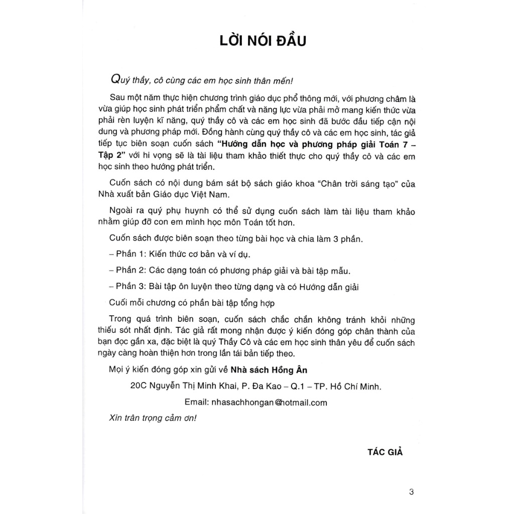 Sau một năm thực hiện chương trình giáo dục phổ thông mới, với phương châm là vừa giúp học sinh phát triển phẩm chất và năng lực vừa phải mở mang kiến thức vừa phải rèn luyện kĩ năng, quý thầy cô và các em học sinh đã bước đầu tiếp cận nội dung và phương pháp mới. Đồng hành cùng quý thầy cô và các em học sinh, tác giả tiếp tục biên soạn cuốn sách Hướng Dẫn Học & Phương Pháp Giải Toán Lớp 7 - Tập 2 với hi vọng sẽ là tài liệu tham khảo thiết thực cho quý thầy cô và các em học sinh theo hướng phát triển.