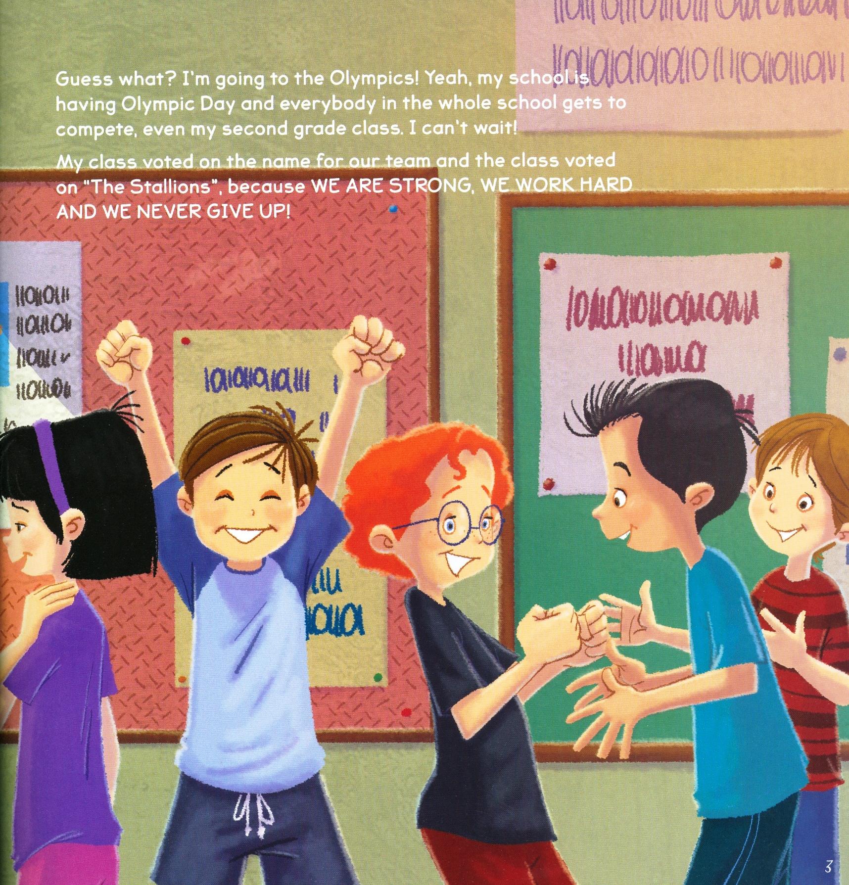 Tớ sẽ tham dự Thế vận hội! Thật tuyệt, trường của tớ tổ chức Ngày hội thể thao và tất cả học trò toàn trường sẽ được thi đấu. Đội lớp tớ chọn tên là Chiến mã, vì chúng tớ mạnh mẽ, chúng tớ sẽ gắng sức, và chúng tớ không bỏ cuộc.