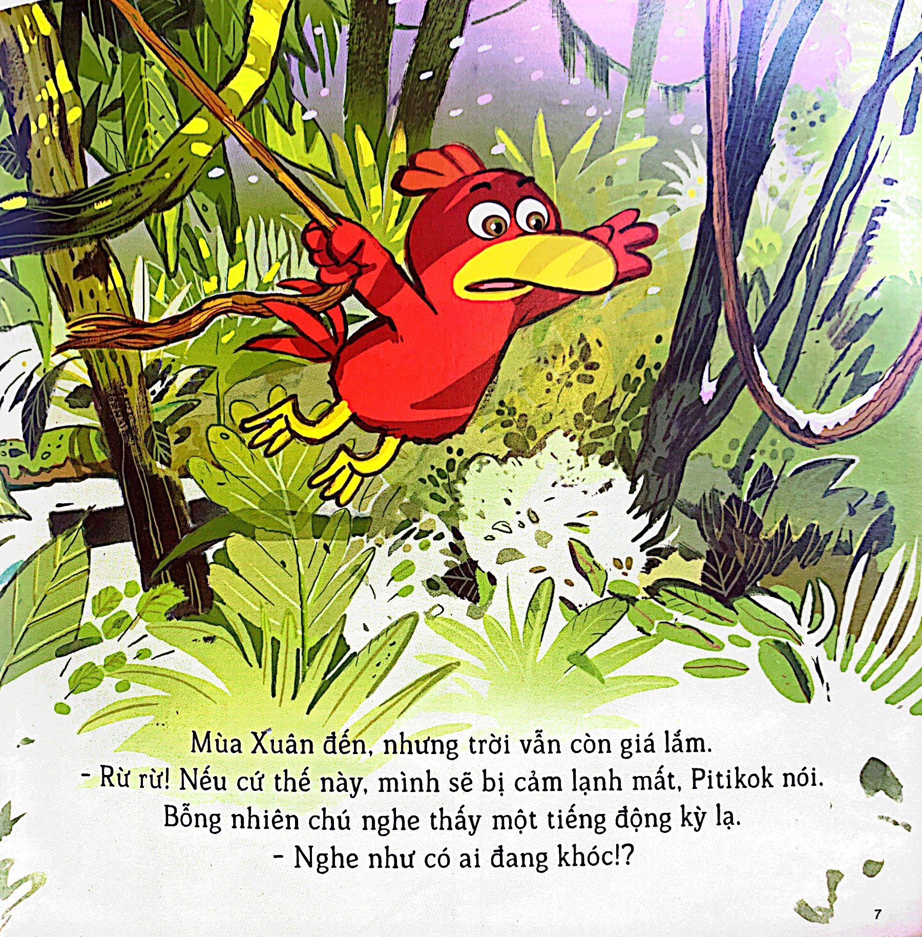 “Cúc cù léc cu!” Pitikok, chú gà giò đỏ dũng cảm, không sao tin nổi vào mắt mình. Chú vừa tìm ra một chú cá đi dạo giữa khu rừng. Kỳ lạ quá phải không nào?