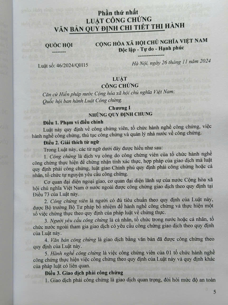 Ngày 26 tháng 11 năm 2024, tại kỳ thứ 8 Quốc hội nước Cộng hòa xã hội chủ nghĩa Việt Nam khóa XV, đã thông qua Luật số 46/2024/QH15 của Quốc hội ban hành Luật Công chứng (sau đây gọi tắt là Luật Công chứng 2024).