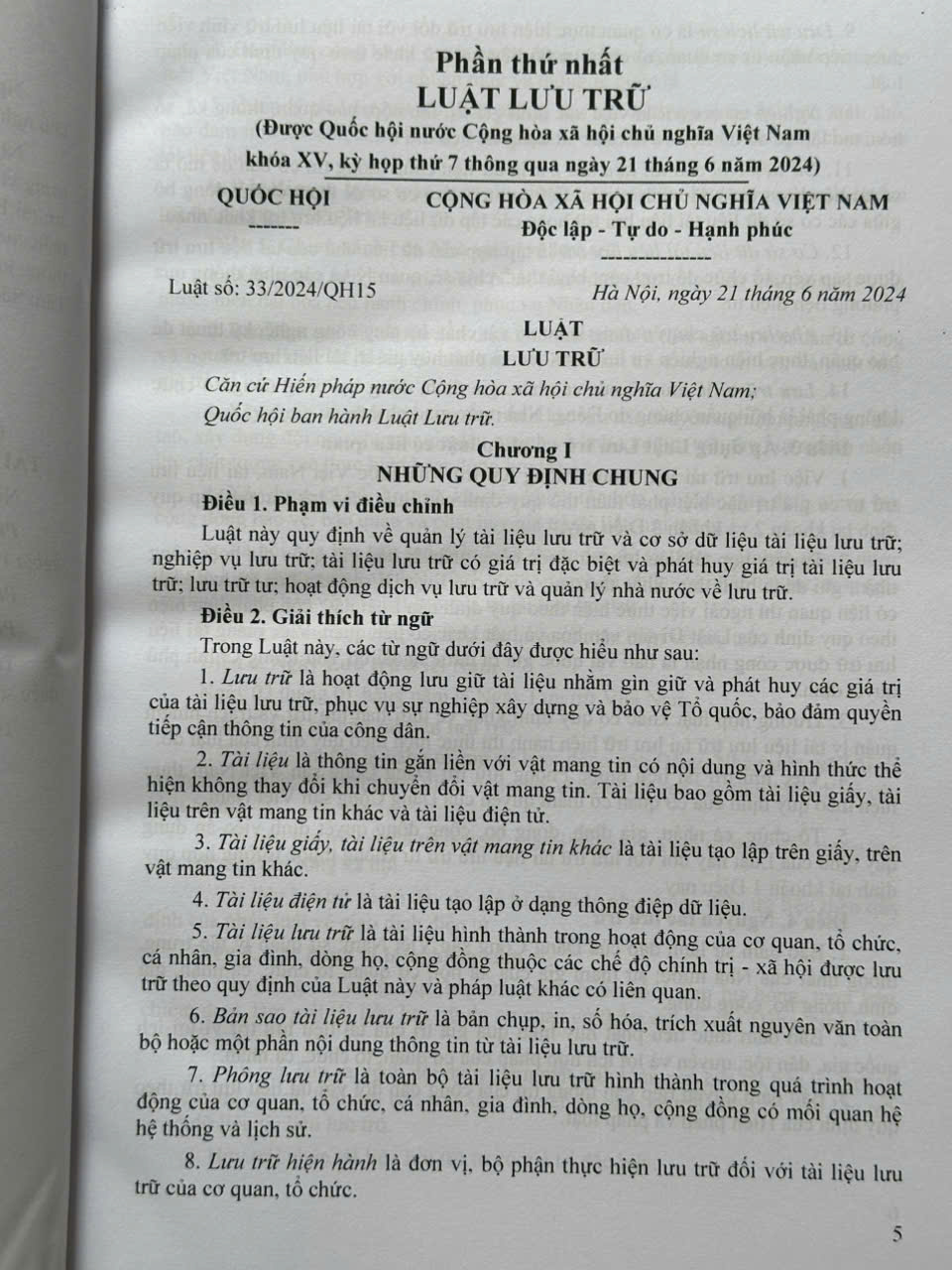Luật Lưu trữ số 33/2024/QH15 (sau đây gọi là Luật Lưu trữ năm 2024) được Quốc hội nước Cộng hòa xã hội chủ nghĩa Việt Nam khóa XV thông qua tại kỳ họp thứ 7