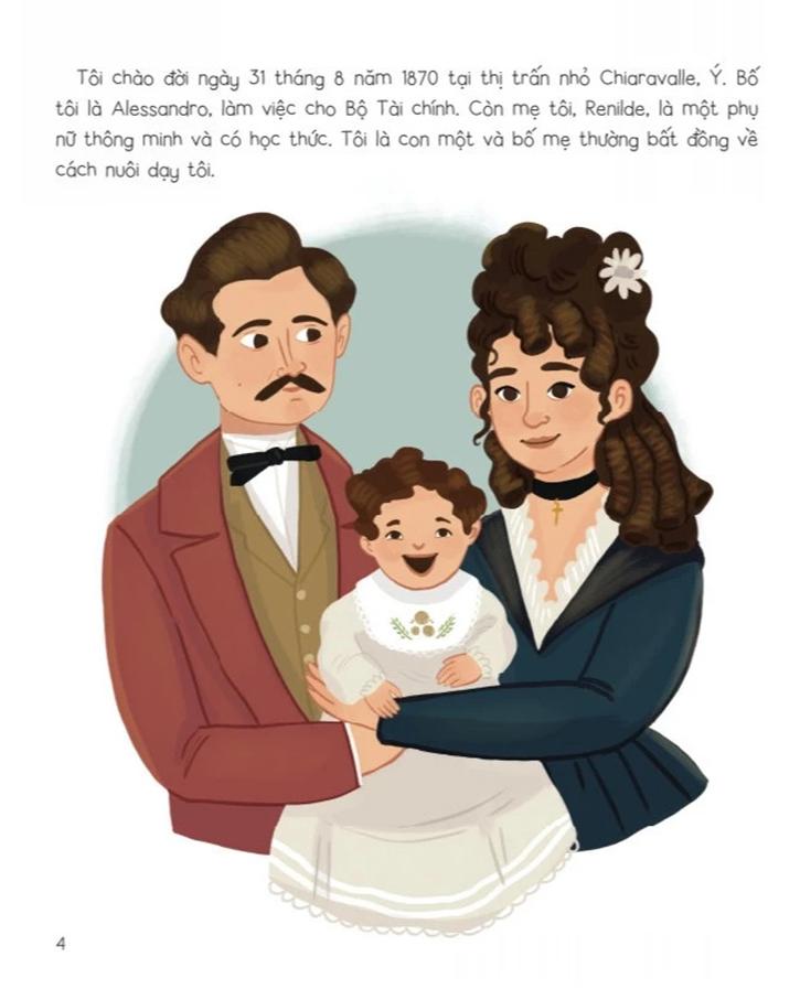 Maria Montessri Tôi là Maria Montessori và tên tôi được mọi người trên toàn thế giới biết đến thông qua hệ thống giáo dục do tôi sáng lập. Phương pháp dạy học trong các trường Montessori dựa trên niềm tin của tôi vào tiềm năng sáng tạo của các bé cũng như việc mỗi đứa trẻ đều có quyền được đối xử như một cá nhân riêng biệt. Hãy dõi theo hành trình tôi mang một phương pháp giáo dục cách mạng đến các quốc gia trên khắp thế giới, một phương pháp bắt nguồn từ cách học tự nhiên của trẻ.