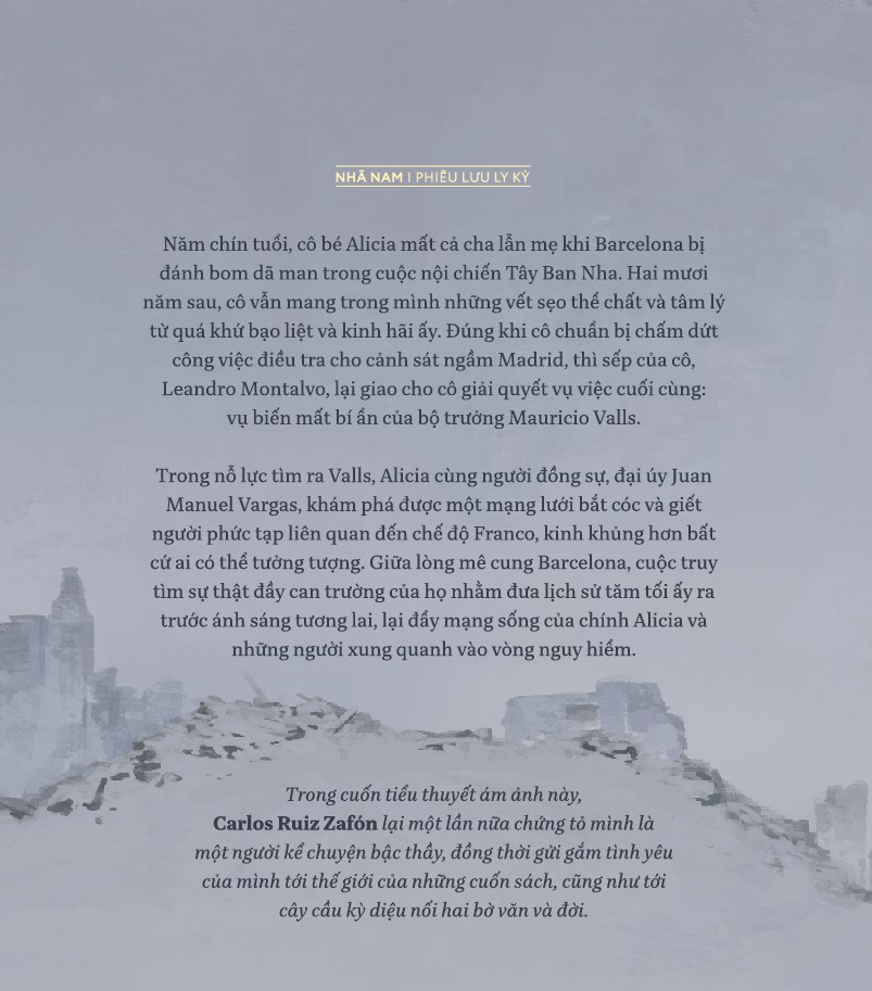 Nhà phát hành: Nhã NamTác giả: Carlos Ruiz ZafónNgày xuất bản: 2025Kích thước : 15.5x 24cmNhà Xuất Bản: Văn HọcLoại bìa: Bìa mềmSố trang: 776Năm chín tuổi, cô bé Alicia mất cả cha lẫn mẹ khi Ba...