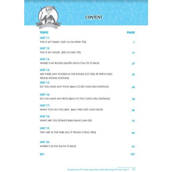 Ms Grammar Ôn luyện Ngữ pháp và Bài tập tiếng Anh lớp 3, tập 2 là cuốn sách ôn luyện ngữ pháp và bài tập Tiếng Anh dành cho học sinh lớp 3. Đây là bộ sách về ngữ pháp Tiếng Anh đầu tiên trên thị trường dành cho học sinh tiểu học Việt Nam, với mong muốn giúp các em học sinh có thể tự học ngữ pháp tại nhà, từ đó nâng cao kỹ năng sử dụng ngữ pháp trong học tập. NHỮNG ƯU ĐIỂM CỦA CUỐN SÁCH: