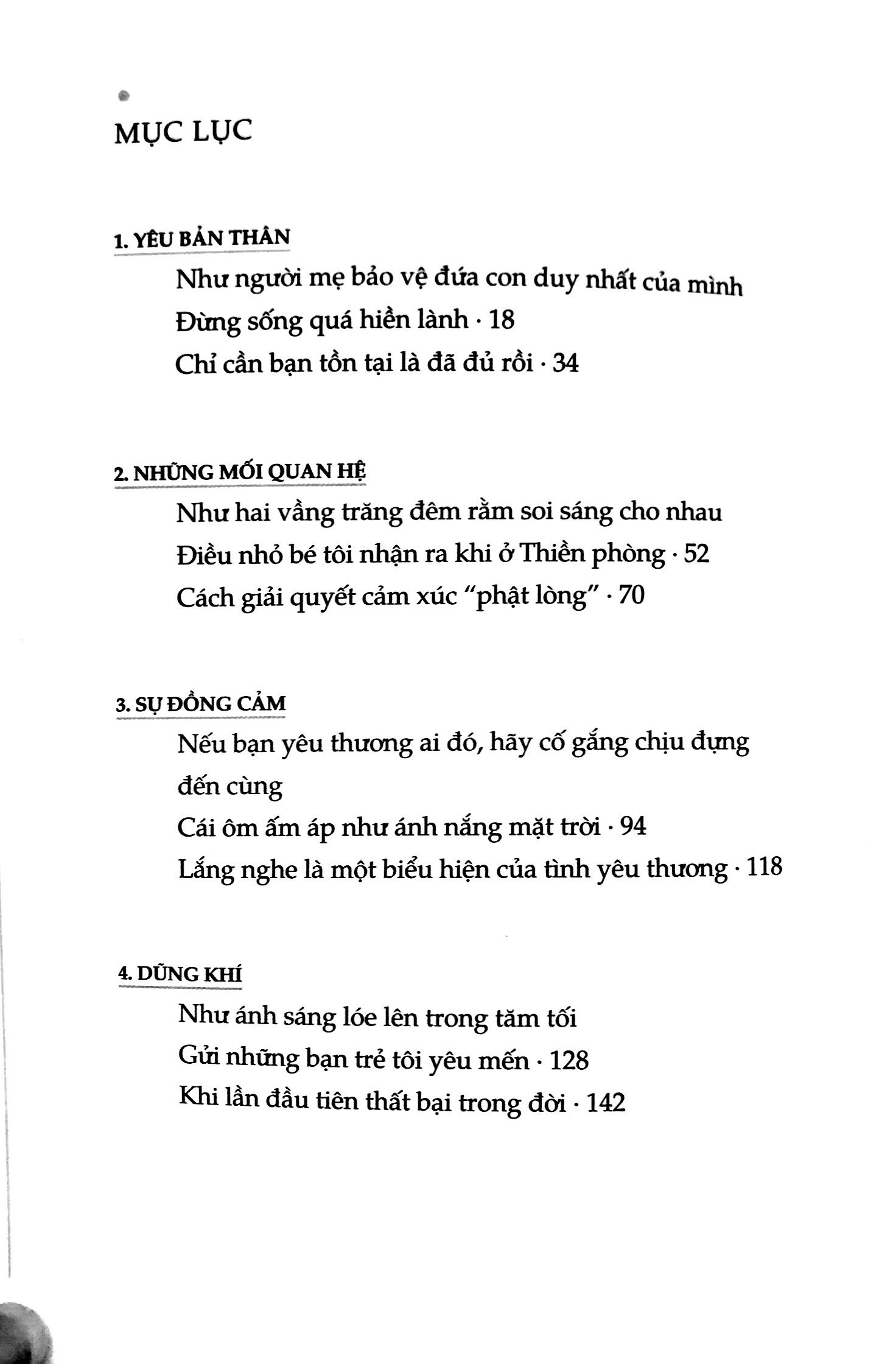 Mong sao những dòng chữ nhỏ bé của tôi có thể đem đến cho độc giả dũng khí, giúp họ chữa lành vết thương lòng và dành ra cho riêng mình khoảng thời gian để yêu bản thân… Mong sao cuốn sách này sẽ trở thành bàn tay giữ lấy bạn khi bạn rơi vào tuyệt vọng, sẽ trở thành khoảng lặng để bạn tạm dừng chân giữa những hỗn độn ồn ào.”