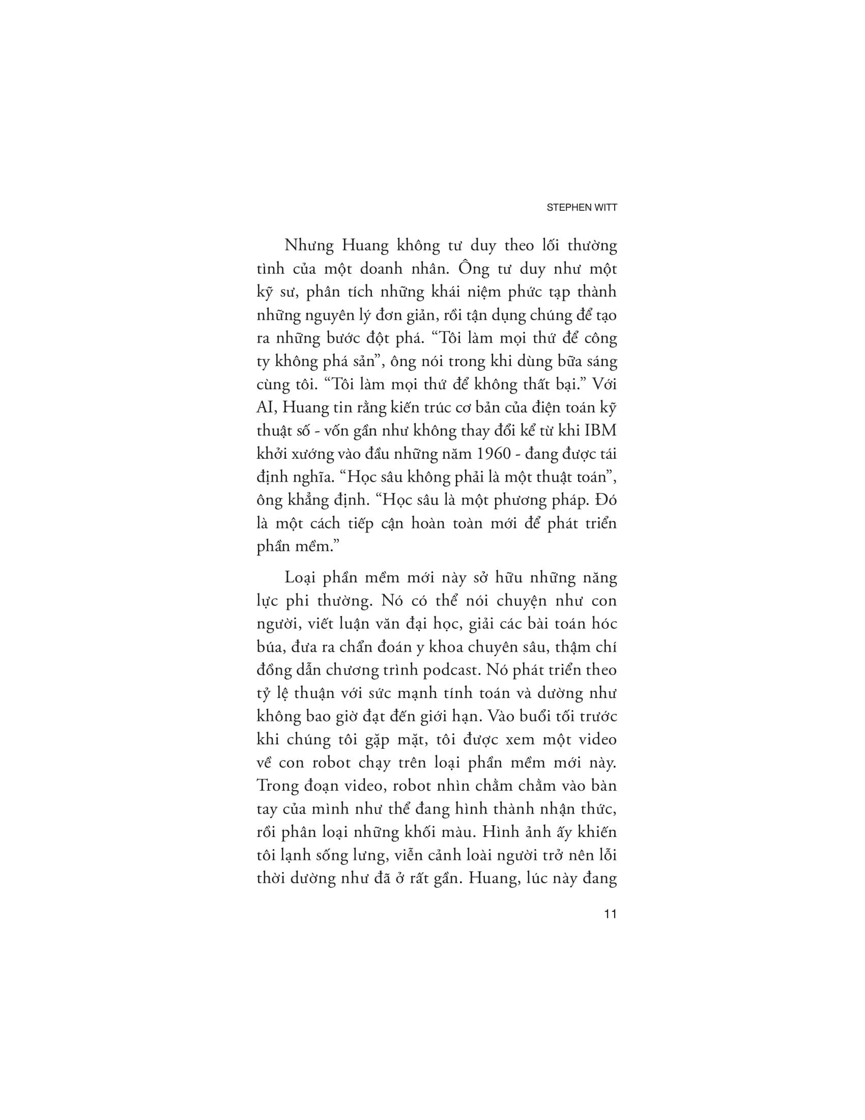 Yếu tố cốt lõi trong sự thành công rực rỡ của NVIDIA chính là CEO Jensen Huang. Hơn một thập kỷ trước, chỉ dựa trên một vài kết quả khoa học hứa hẹn, ông đã đặt cược toàn bộ công ty của m.ình vào AI. Với việc thực hiện hàng loạt cuộc phỏng vấn với Huang, bạn bè, các nhà đầu tư và nhân viên của ông, Stephen Witt đã ghi lại hành trình vươn lên của công ty này cùng với vị lãnh đạo kiên định và quyết liệt, người giờ đây là một trong những nhân vật có ảnh hưởng nhất Thung lũng Silicon.