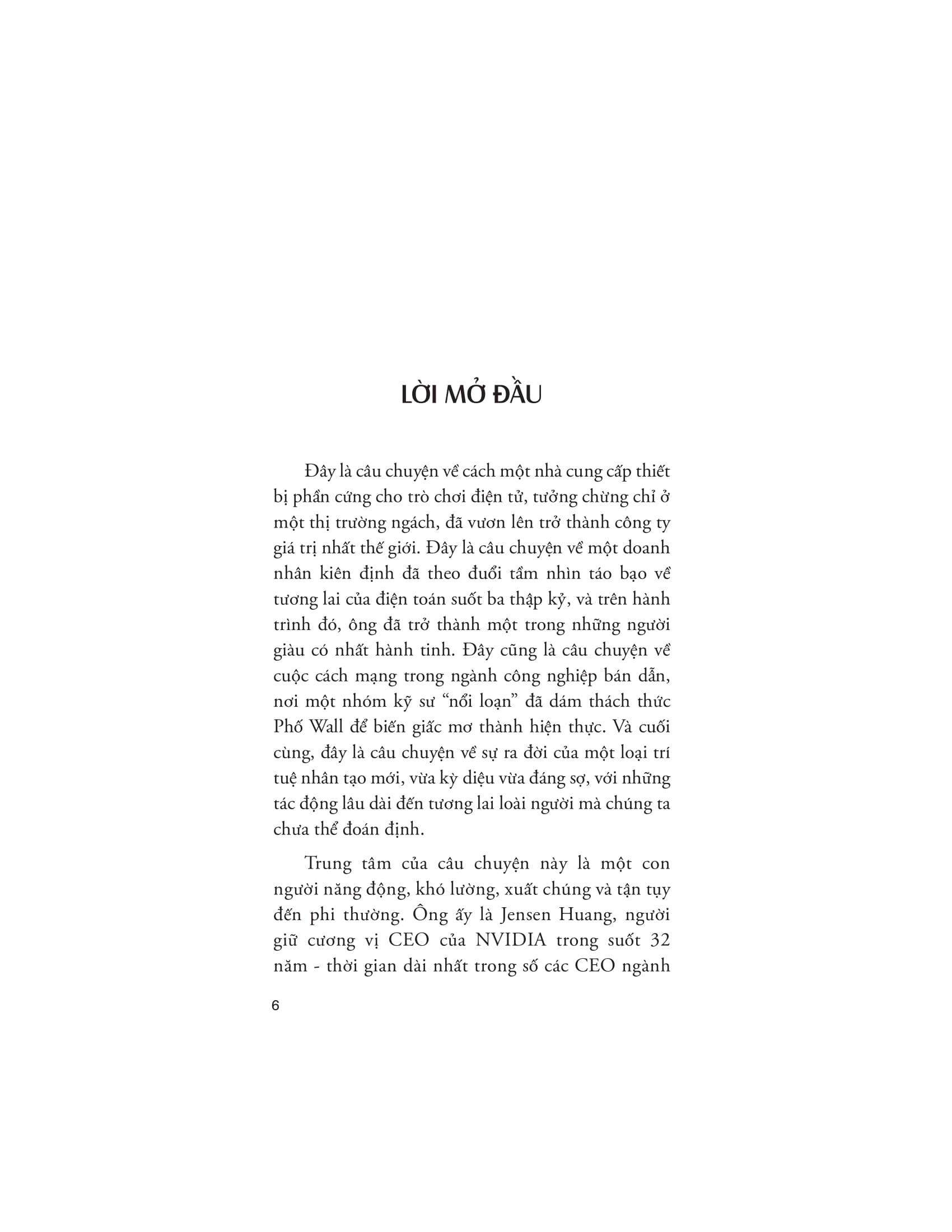 NVIDIA có giá trị ngang với Apple và Microsoft. NVIDIA góp phần quan trọng định hình nên thế giới ngày nay, nhưng câu chuyện về nó vẫn ít được biết đến. Cuốn sách trên tay bạn chính là câu chuyện toàn diện, đặc biệt chuyên sâu về công ty công nghệ vĩ đại nhất thời đại chúng ta.