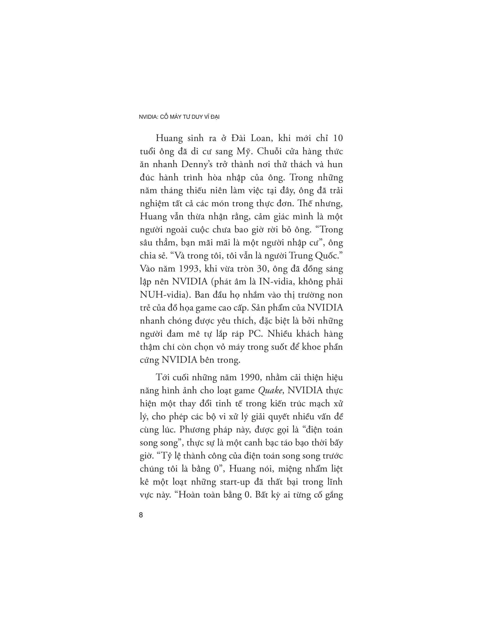 “NVIDIA: Cỗ máy tư duy vĩ đại” là câu chuyện về cách NVIDIA phát triển thành nhà cung cấp siêu máy tính trị giá hàng trăm triệu đô la, cũng là câu chuyện về một doanh nhân kiên định, người đã thách thức Phố Wall để theo đuổi tầm nhìn táo bạo về điện toán. Đây là câu chuyện về một cuộc cách mạng trong kiến trúc máy tính, do một nhóm nhỏ các kỹ sư “nổi loạn” tạo ra. Và hơn hết, đây còn là câu chuyện về tương lai AI đầy ấn tượng nhưng cũng đáng sợ, điều mà Huang gọi là “cuộc cách mạng công nghiệp tiếp theo”. Đây là câu chuyện về sự ra đời của một loại trí tuệ nhân tạo mới, vừa kỳ diệu vừa đáng sợ, với những tác động lâu dài đến loài người mà chúng ta chưa thể đoán định.