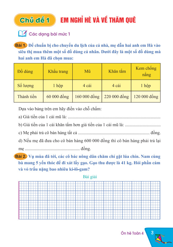 Trong năm học lớp 4 vừa qua, các em đã hết sức nỗ lực trong học tập và đạt được nhiều kết quả tốt đẹp. Giờ đây, rất nhiều các hoạt động mùa hè đang chào đón các em: thả diều, tập bơi, đi du lịch, về quê thăm ông bà, những buổi đi chợ với mẹ hay tham gia các hoạt động từ thiện và bảo vệ môi trường. Tập thể tác giả cuốn sách Ôn hè Toán 4 mong muốn được đồng hành cùng các em qua các hoạt động hè như thế.